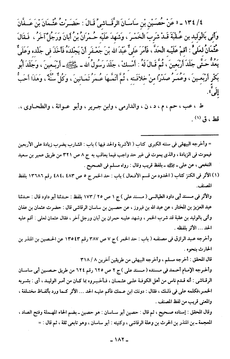 4/ 134 - " عَنْ حُصَيْنِ بْنِ سَاسَانَ الرِّقاشِىِّ قَالَ: حَضَرْتُ عثمَانَ بْنَ عَفَّانَ وَأُتِى بَالوَلِيد بن عُقْبَةَ قَدْ شَرِبَ الخَمْرَ، وَشَهِدَ عَلَيْهِ حُمْرَانُ بْنُ أبانَ وَرَجُلٌ آخَرُ، فَقَالَ عثمَانُ لعَلىٍّ: أقِمْ عَلَيْهِ الحَدَّ، فَأمَرَ عَلِىٌّ عَبْدَ الله بْنَ جَعْفَرٍ أنْ يَجْلدَهُ فَأخَذَ فِى جَلدِهِ وَعَلَىٌّ يَعُدُّ حتَّى جَلَدَ أَرْبَعِينَ، ثُمَّ قَالَ لَهُ: أَمْسِكْ، جَلَدَ رَسُولُ الله - صلى الله عليه وسلم - أَرْبَعينَ، وَجَلَدَ أبُو بَكْرٍ أرْبَعِينَ، وَعُمَرُ صَدْرًا مِنْ خِلاَفَتِهِ، ثُمَّ أَتَمَّهَا عُمَرُ ثَمَانِينَ، وَكُلٌّ سُنَّةٌ، وَهَذَا أَحَبُّ إِلَىَّ ".