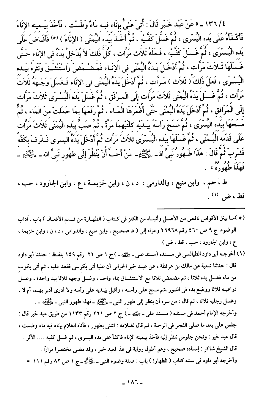 4/ 136 - " عَنْ عَبْدِ خَيْرٍ قَالَ: أُتِىَ عَلىٌّ بِإِنَاءٍ فِيه مَاء وَطَسْتٍ، فَأخَذَ بِيَمِينِه الإِنَاءَ فَأكْفَأهُ عَلَى يَدِهِ اليُسْرى، ثُمَّ غَسَلَ كَفَّيْه، ثُمَّ أَخَذَ بيَدِه اَليُمْنَى (الإنَاءَ) (*) فَأفَاضَ عَلَى يَده اليُسْرَى، ثُمَّ غَسَلَ كَفَّيْه، فَعَلَهُ ثَلاث مَرَّاتٍ، كُلَّ ذَلِكَ لاَ يُدْخِلُ يَدهُ فِى الإنَاءِ حَتَّى غَسَلَهَا ثَلاَثَ مَرَّاتٍ، ثُمَّ أَدْخَلَ يَدَهُ اليُمْنَى فِى الإنَاء فَمَضْمَضَ وَاسْتَنْشَقَ وَنَثَرهُ بِيَدِهِ اليُسْرَى، فَعَلَ ذَلِكَ (ثَلاَث) مَرَّاتٍ، ثُمَّ أَدْخَلَ يَدَهُ اليُمْنَى فِى الإِنَاءِ فَغَسَلَ وَجْهَهُ ثَلاَثَ مَرَّاتٍ، ثُمَّ غَسَلَ يَدَهُ اليُمْنَى ثَلاَثَ مَرَّاتٍ إِلَى المرْفَقِ، ثُمَّ غَسَلَ يَدَه اليُسْرَى ثَلاَثَ مَرَّاتٍ إِلَى المَرَافِقِ، ثُمَّ أَدْخَلَ يَدَهُ اليُمْنَى حَتَّى أَغْمَرَهَا المَاء، ثُمَّ رَفَعَهَا بمَا حَمَلتْ منَ المَاءِ، ثُمَّ مَسَحَهَا بِيَدِه اليُسْرَى، ثُمَّ مَسَحَ رَأسَهُ بيَدَيْهِ كِلتَيْهِمَا مَرَّةً، ثُمَّ صَبَّ بِيَدِهِ اليُمْنَىَ ثَلاَثَ مَرَّاتٍ عَلَى قَدَمِه اليُمْنَى، ثُمَّ غَسَلَهَا بِيَدِه اليُسْرَى ثلاَثَ مَرَّاتٍ ثُمَّ أَدْخَلَ يَدَهُ اليُسرى فَغَرفَ بكَفِّهِ فَشَرِبَ ثُمَّ قَالَ: هَذَا طَهُورُ نَبِىِّ الله - صلى الله عليه وسلم - مَنْ أحَبَّ أن يَنْظُرَ إِلَى طهُورِ نَبِىِّ الله - صلى الله عليه وسلم - فَهَذَا طُهُورُهُ ".