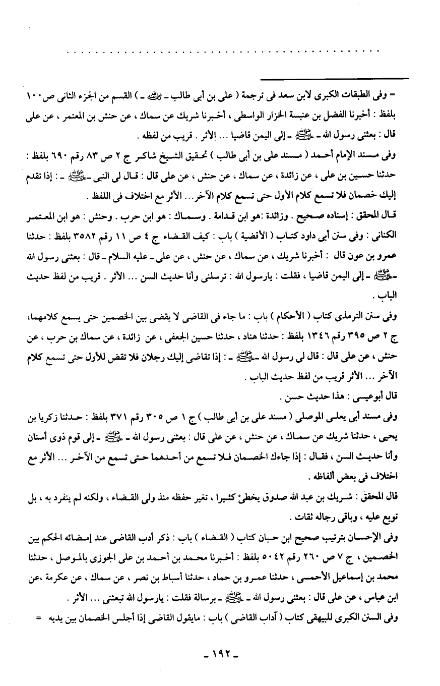 وفى مسند الإمام أحمد (مسند على بن أبى طالب) تحقيق الشيخ شاكر ج 2 ص 83 رقم 690 بلفظ: حدثنا حسين بن على، عن زائدة، عن سماك، عن حنش، عن على قال: قال لى النبي - صلى الله عليه وسلم -: إذا تقدم إليك خصمان فلا تسمع كلام الأول حتى تسمع كلام الآخر ... الأثر مع اختلاف في اللفظ.