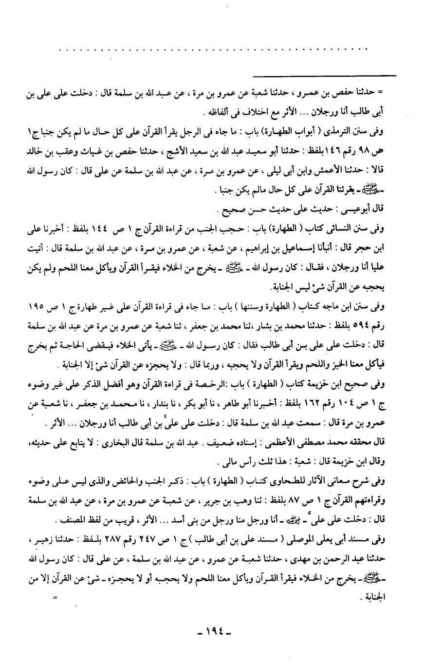 وفى سنن الترمذى (أبواب الطهارة) باب: ما جاء في الرجل يقرأ القرآن على كل حال ما لم يكن جنبا ج 1 ص 98 رقم 146 بلفظ: حدثنا أبو سعيد عبد الله بن سعيد الأشج، حدثنا حفص بن غياث وعقب بن خالد قالا: حدثنا الأعمش وابن أبى ليلى، عن عمرو بن مرة، عن عبد الله بن سلمة عن على قال: كان رسول الله - صلى الله عليه وسلم - يقرئنا القرآن على كل حال ما لم يكن جنبا.