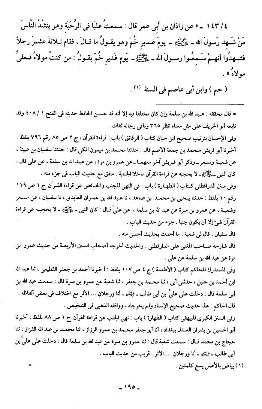 4/ 143 - " عن زاذان بن أَبِى عمر قال: سمعتُ عليًّا في الرَّحبَةِ وهو ينشُدُ النَّاسَ: مَنْ شَهِد رَسولَ الله - صلى الله عليه وسلم - يومَ غديرِ خُمّ وهو يقولُ ما قالَ، فقام ثلاثةَ عشرَ رجلًا فشهدُوا أنهمْ سَمِعُوا رسولَ الله - صلى الله عليه وسلم - يَوم غَديرِ خُمّ يقولُ: من كنتُ مولاهُ فعلىٌّ مولاهُ ".