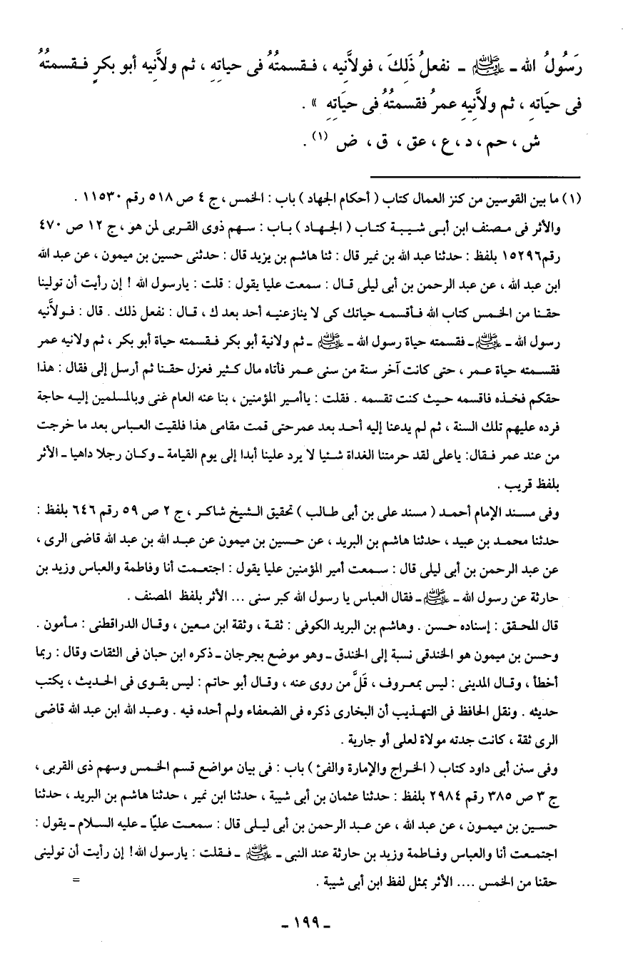 والأثر في مصنف ابن أبى شيبة كتاب (الجهاد) باب: سهم ذوى القربى لمن هو، ج 12 ص 470 رقم 15296 بلفظ: حدثنا عبد الله بن نمير قال: ثنا هاشم بن يزيد قال: حدثنى حسين بن ميمون، عن عبد الله ابن عبد الله، عن عبد الرحمن بن أبى ليلى قال: سمعت عليا يقول: قلت: يا رسول الله! إن رأيت أن تولينا حقنا من الخمس كتاب الله فأقسمه حياتك كى لا ينازعنيه أحد بعدك، قال: نفعل ذلك. قال: فولاَّنيه رسول الله - صلى الله عليه وسلم - فقسمته حياة رسول الله - صلى الله عليه وسلم - ثم ولانيه أبو بكر فقسمته حياة أبو بكر، ثم ولانيه عمر فقسمته حياة عمر، حتى كانت آخر سنة من سنى عمر فأتاه مال كثير فعزل حقنا ثم أرسل إلي فقال: هذا حقكم فخذه فاقسمه حيث كنت تقسمه. فقلت: يا أمير المؤمنين، بنا عنه العام غنى وبالمسلمين إليه حاجة فرده عليهم تلك السنة، ثم لم يدعنا إليه أحد بعد عمر حتى قمت مقامى هذا فلقيت العباس بعد ما خرجت من عند عمر فقال: يا على لقد حرمتنا الغداة شيئًا لا يرد علينا أبدا إلى يوم القيامة - وكان رجلًا داهيا - الأثر بلفظ قريب.