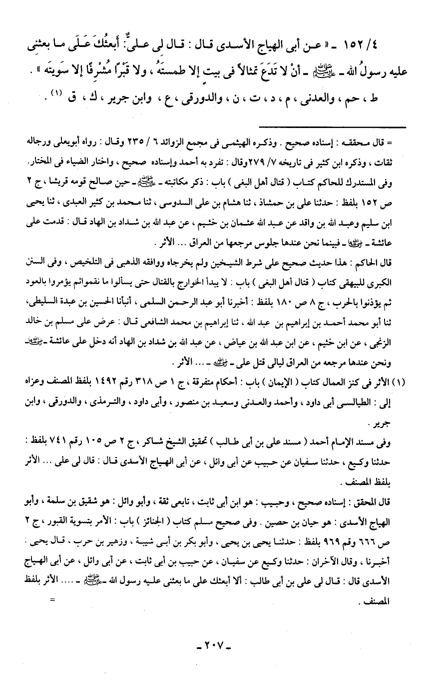 4/ 152 - "عن أبى الهياج الأسدى قال: قال لِى علىٌّ: أَبعثُكَ عَلَى ما بعثنِى عليه رسولُ الله - صلى الله عليه وسلم - أنْ لا تَدَعَ تمثالًا في بيت إلا طمستَهُ، ولا قَبْرًا مُشْرِفًا إلا سَويتَه".