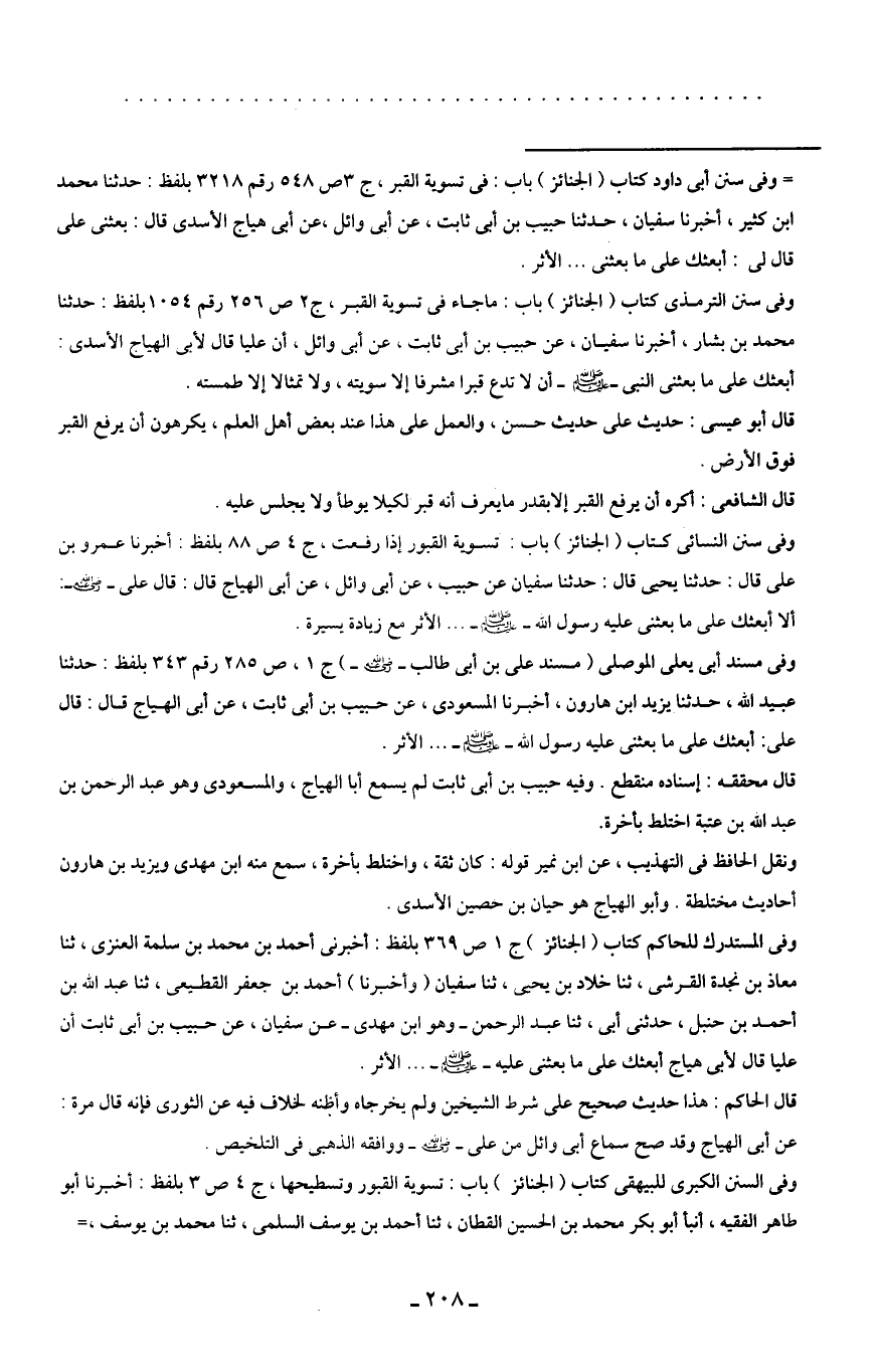 = وفى سنن أبى داود كتاب (الجنائز) باب: في تسوية القبر، ج 3 ص 548 رقم 3218 بلفظ: حدثنا محمد ابن كثير، أخبرنا سفيان، حدثا حبيب بن أبى ثابت، عن أبى وائل، عن أبى هياج الأسدى قال: بعثنى على قال لى: أبعثك على ما بعثنى ... الأثر.