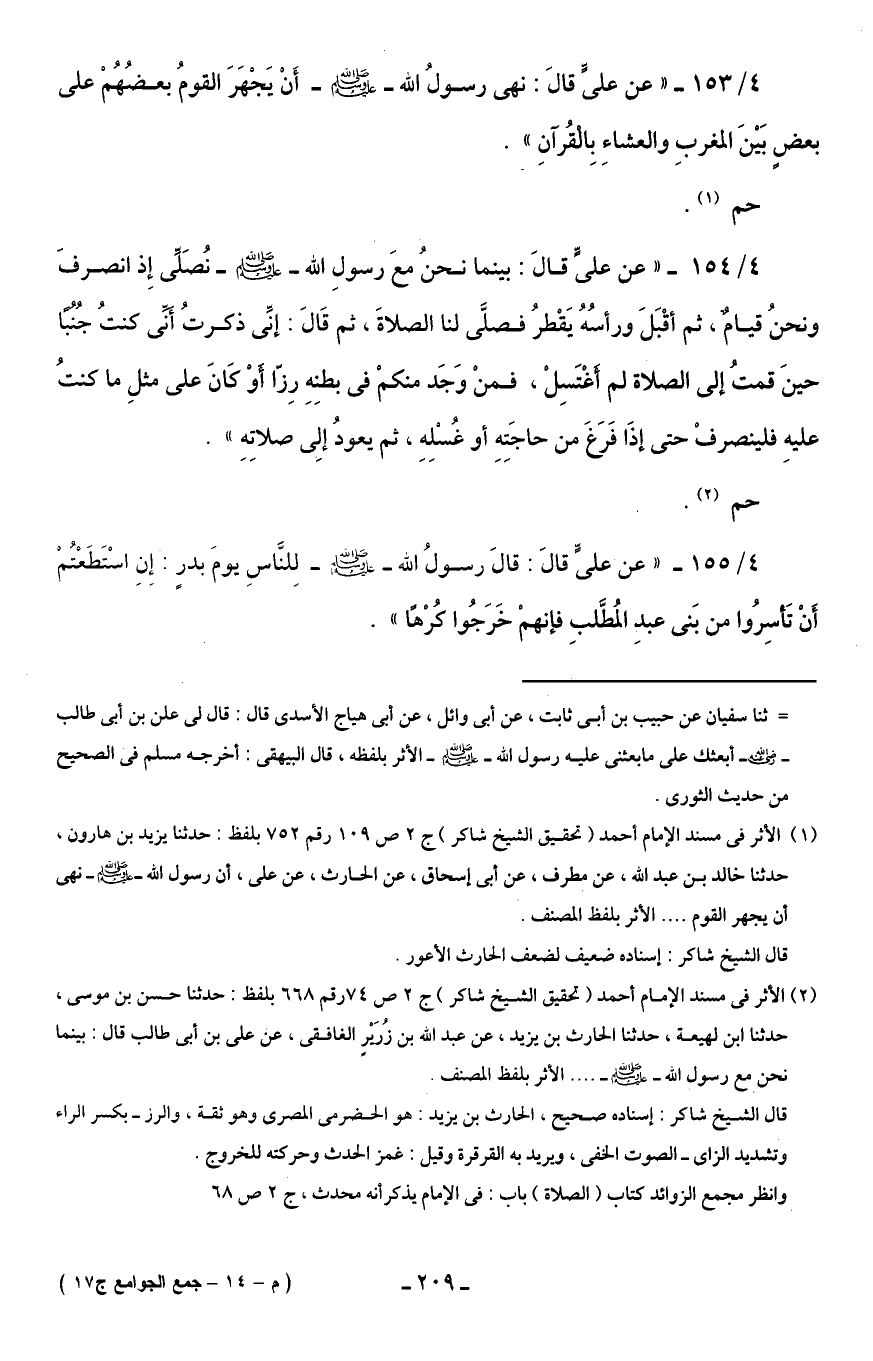 (¬1) الأثر في مسند الإمام أحمد (تحقيق الشيخ شاكر) ج 2 ص 109 رقم 752 بلفظ: حدثنا يزيد بن هارون، حدثنا خالد بن عبد الله، عن مطرف، عن أبى إسحاق، عن الحارث، عن على، أن رسول الله - صلى الله عليه وسلم - نهى أن يجهر القوم ... . الأثر بلفظ المصنف.