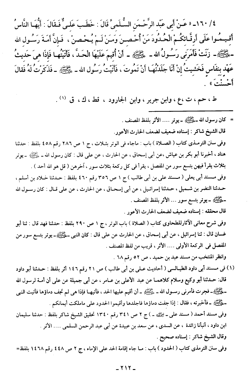 4/ 160 - "عَنْ أَبِى عَبْدِ الرَّحْمَنِ السُّلَمِى قَالَ: خَطَبَ عَلِىّ فَقَالَ. أَيُّهَا النَّاسُ أَقِيمُوا عَلَى أَرِقَّائِكُمْ الحُدُودَ مَنْ أُحْصِنَ وَمَنْ لَمْ يُحْصنْ، فَإِنَّ أَمَةَ رَسُولِ الله - صلى الله عليه وسلم - زَنَتْ فَأمَرَنِى رَسُولُ الله - صلى الله عليه وسلم - أنْ أُقيمَ عَلَيْهَا الحَدَّ، فَأتَيْتُها فَإِذَا هِىَ حَدِيثُ عَهْدِ بِنِفَاسٍ فَخَشِيتُ إِنْ أَنَا جَلَدْتُهَا أَنْ تَمُوتَ، فَأتَيْتُ رَسُول الله - صلى الله عليه وسلم - فَذَكَرْتُ لَهُ فَقالَ أحْسنْتَ".