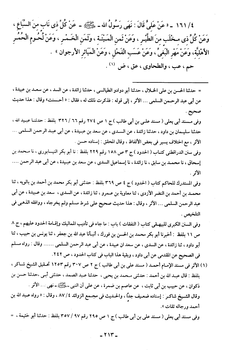 4/ 161 - "عَنْ عَلِىٍّ قَالَ: نَهَى رَسُولُ الله - صلى الله عليه وسلم - عَنْ كُلِّ ذِى نَابٍ مِنَ السِّباع، وَعَنْ كُل ذِى مِخْلَب مِنَ الطَّيْرِ، وَعَنْ ثَمنِ المَيْتَةِ، وَثَمَنِ الخَمْرِ، وَعَنْ لُحُوم الحُمُرِ الأهْلِيَّةِ، وَعَنْ مَهْرِ البَغىِّ، وَعَنْ عَسَبِ الفَحْلِ، وَعَنْ المَيَاثِرِ الأرجوان".