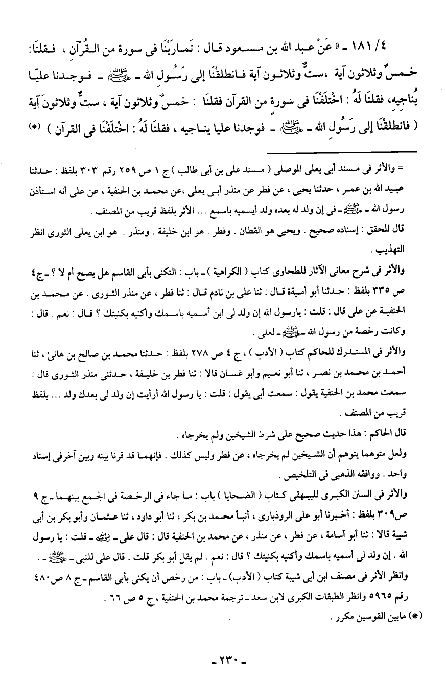 4/ 181 - " عَنْ عبد الله بن مسعود قال: تَمارَيْنَا في سورة من القُرآنِ، فقلنَا: خمسٌ وثلاثون آية، ستٌّ وثلاثون آية فانطلقْنَا إلى رَسُول الله - صلى الله عليه وسلم - فوجدنا عليّا يُناجِيهِ، فقلنَا لَهُ: اخْتلَفْنَا في سورةٍ من القرآن فقلنَا: خمسٌ وَثلاثون آية، ستٌّ وثلاثونَ آية (فانطلقْنَا إلى رَسُولِ الله - صلى الله عليه وسلم - فوجدنا عليا يناجيه، فقلنَا لَهُ: اخْتلَفْنَا في القرآن) (*)
