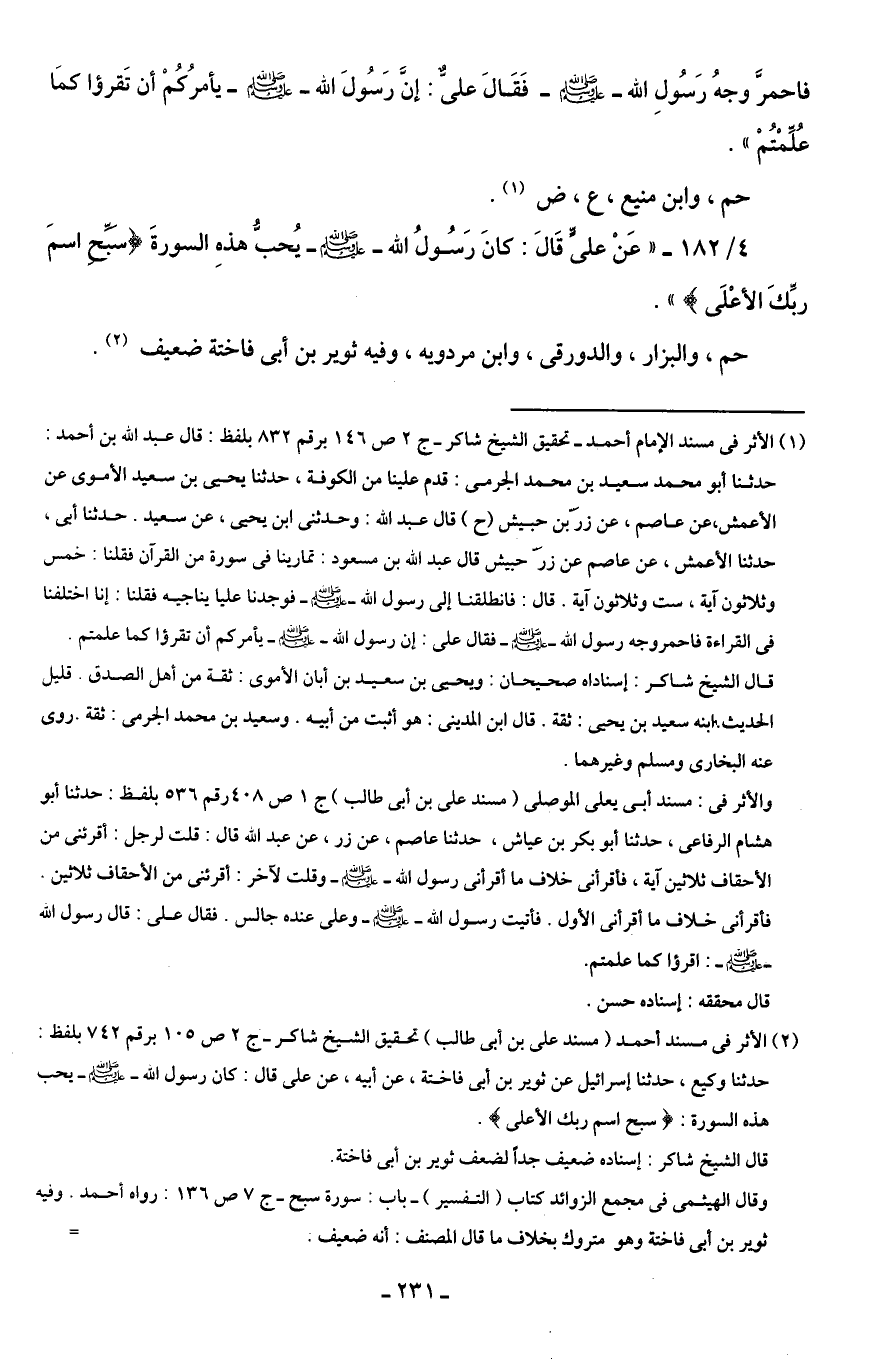 (¬2) الأثر في مسند أحمد (مسند على بن أبى طالب) تحقيق الشيخ شاكر - ج 2 ص 105 برقم 742 بلفظ: حدثنا وكيع، حدثنا إسرائيل عن ثوير بن أبى فاختة، عن أبيه، عن على قال: كان رسول الله - صلى الله عليه وسلم - يحب هذه السورة: {سَبِّحِ اسْمَ رَبِّكَ الْأَعْلَى (1)}.