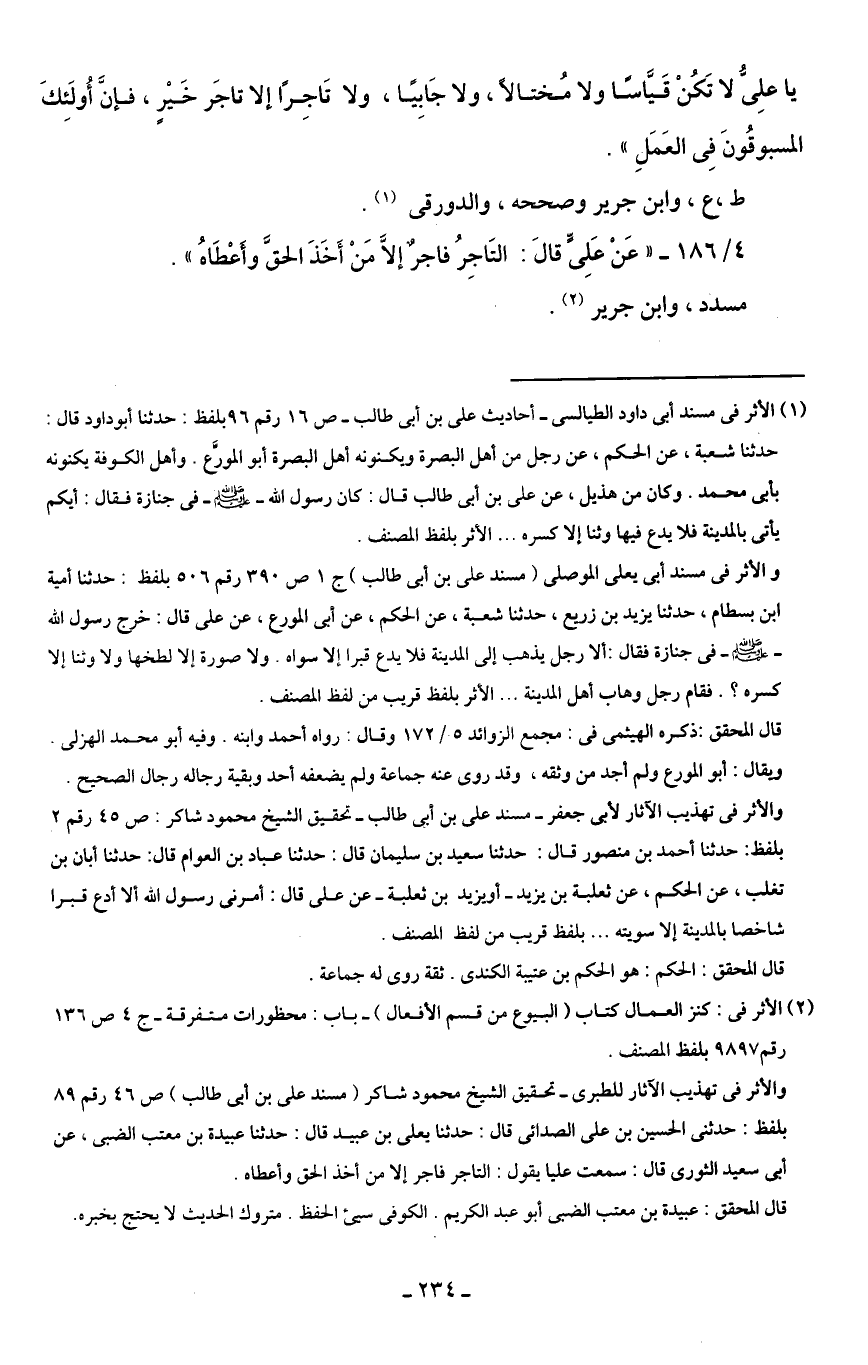 4/ 186 - " عَنْ عَلِىٍّ قالَ: التَاجِرُ فاجرٌ إلاَّ مَنْ أَخَذَ الحقَّ وأَعْطَاهُ ".
