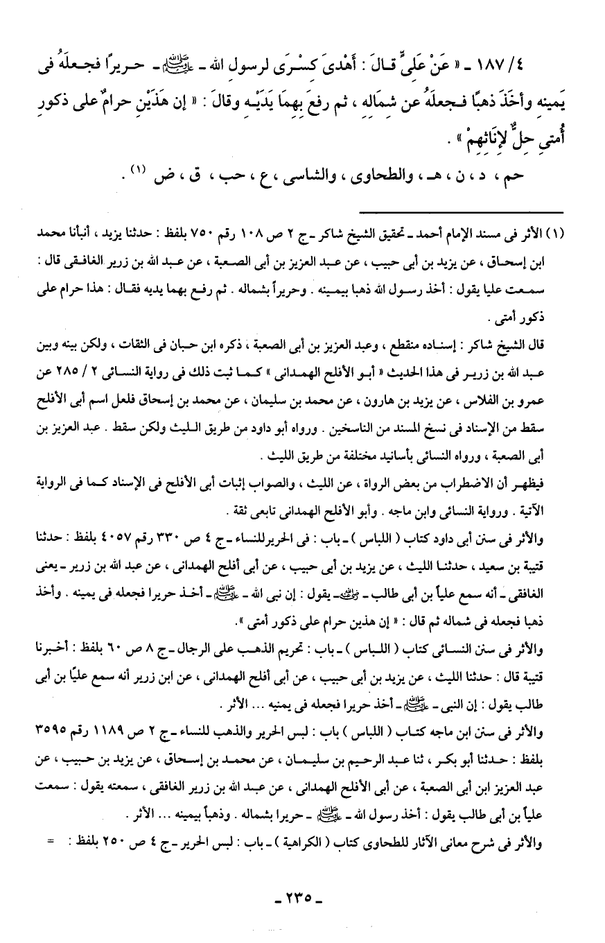 4/ 187 - " عَنْ عَلِىٍّ قالَ: أَهْدىَ كسْرَى لرسولِ الله - صلى الله عليه وسلم - حريرًا فجعلَهُ في يَمينهِ وأخَذَ ذهبًا فجعلَهُ عن شِمَالِهِ، ثم رفعَ بِهِمَا يَدَيْهِ وقالَ: " إن هَذَيْنِ حرامٌ على ذكورِ أُمتي حِلٌّ لإِنَاثِهِمْ ".