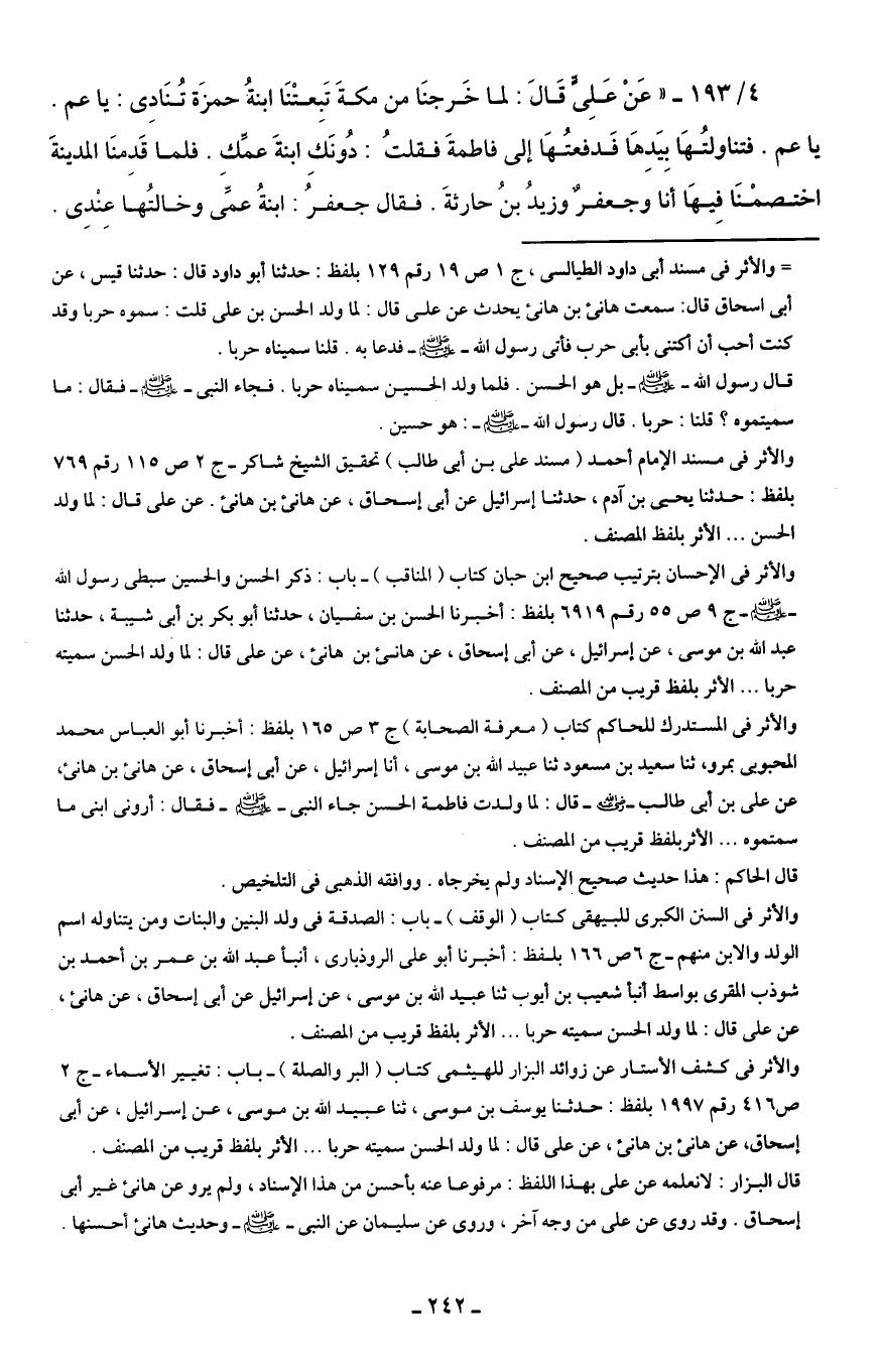 4/ 193 - " عَنْ عَلِىٍّ قَالَ: لما خَرجنَا من مكةَ تَبِعتْنَا ابنةُ حمزَة تُنَادِى: يا عم. يا عم. فتناولتُهَا بِيَدِهَا فَدفعتُهَا إلى فاطمةَ فقلتُ: دُونَكِ ابنةَ عمِّكِ. فلما قَدِمنَا المدينةَ اختصمْنَا فِيهَا أنا وجعفرٌ وزيدُ بنُ حارثةَ. فقال جعفرُ. ابنةُ عمِّىَ وخالتُها عِنْدِى.