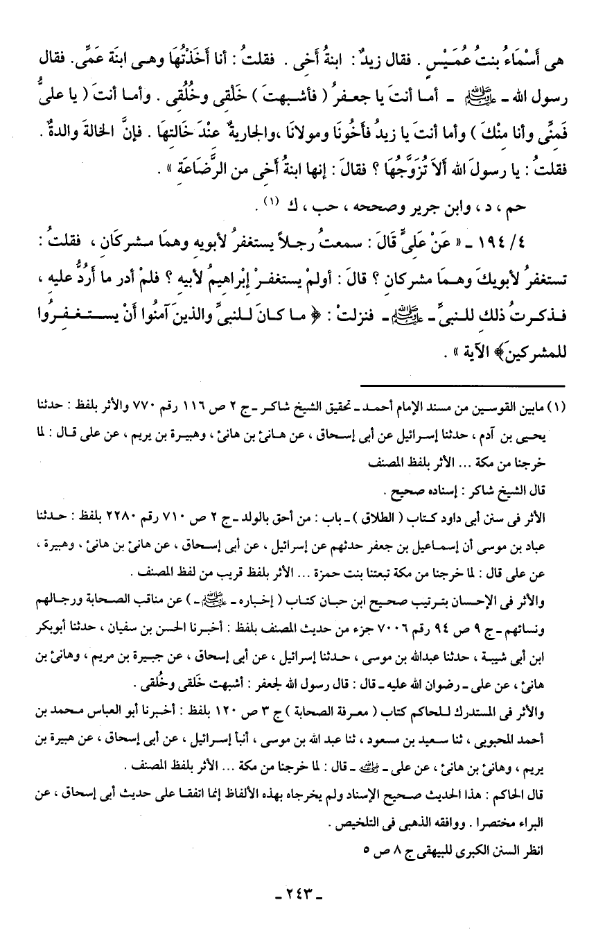 4/ 194 - " عَنْ عَلِىٍّ قَالَ: سمعتُ رجلًا يستغفرُ لأبويهِ وهمَا مشركَانِ، فقلتُ: تستغفرُ لأبويكَ وهمَا مشركانِ؟ قالَ: أولمْ يستغفرْ إِبْراهِيمُ لأبيهِ؟ فلمْ أدر ما أَرُدُّ عليهِ، فذكرتُ ذلكِ للنبىِّ - صلى الله عليه وسلم - فنزلتْ: {مَا كَانَ لِلنَّبِيِّ وَالَّذِينَ آمَنُوا أَنْ يَسْتَغْفِرُوا لِلْمُشْرِكِينَ} الآية ".