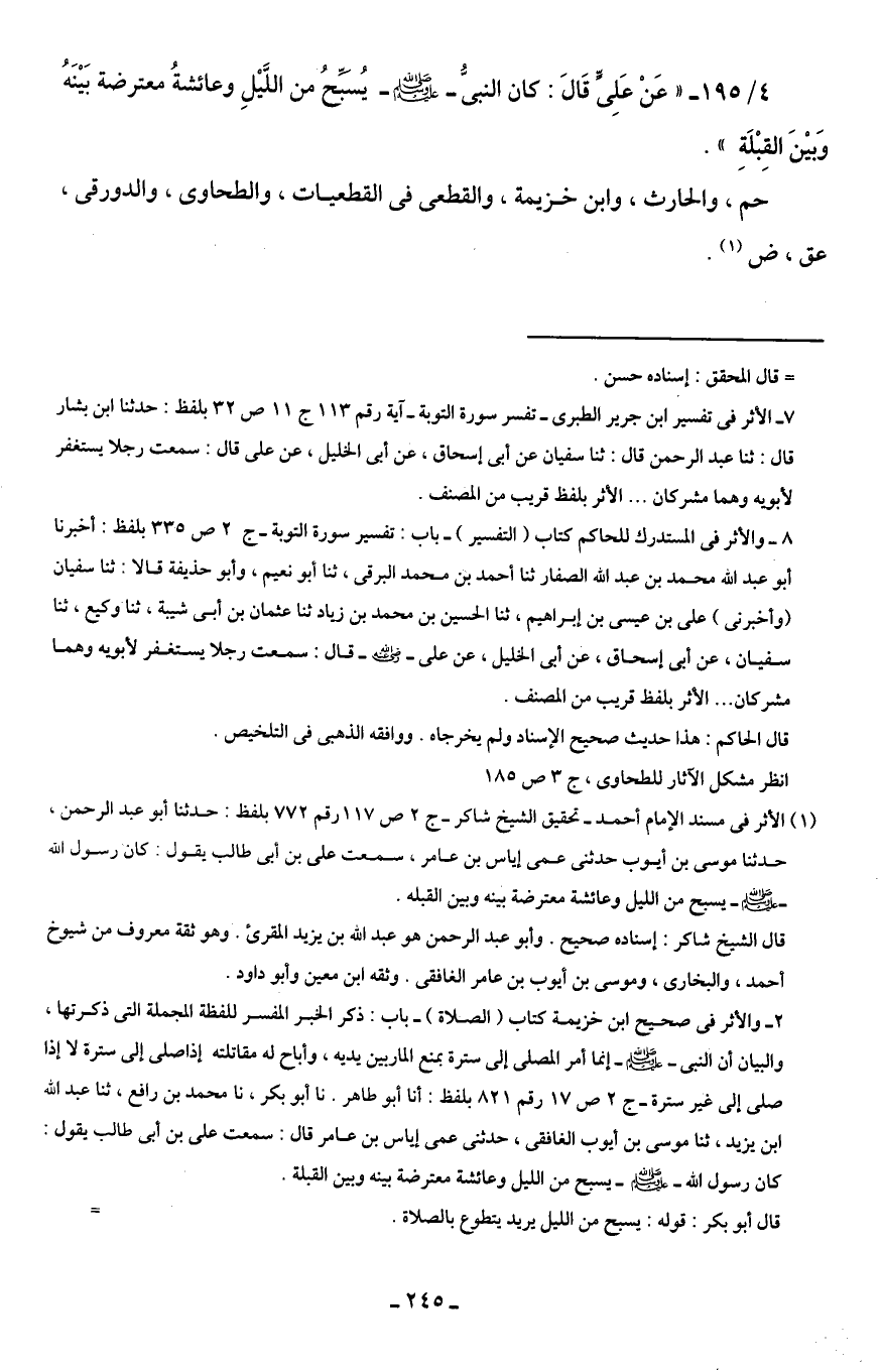 4/ 195 - " عَنْ عَلِىٍّ قَالَ: كان النبىُّ - صلى الله عليه وسلم - يُسَبِّحُ من اللَّيْلِ وعائشةُ معترضة بَيْنَهُ وَبيْنَ القِبْلَةِ ".