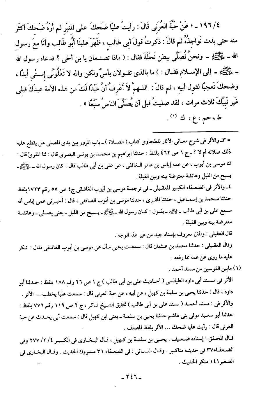 4/ 196 - " عَنْ حَبَّةَ العُرَنِى قَالَ: رأيتُ عليّا ضَحِكَ على المِنبَرِ لم أَرَهُ ضَحِكَ أكثَر منه حتى بدت نَواجِذُهُ ثم قالَ: ذكرتُ قولَ أبِى طالبٍ، ظَهَرَ علينَا أَبُو طَالِب وأنَا معَ رسولِ الله - صلى الله عليه وسلم - ونحنُ نُصَلِّى ببطن نَحْلَةَ فقال: (ماذا تصنعان يا بن أخى؟ فدعاه رسول الله - صلى الله عليه وسلم - إلى الإسلام فقال: ) ما بالذى تقولان بأسٌ ولكن والله لا تَعْلُونِّى إِستْي أَبدًا، وضحكَ تَعجبًا لقوِل أبيهِ، ثم قالَ: اللهمَّ لاَ أَعْرِفُ أنَّ عَبْدًا لَكَ من هذه الأمة عبدَكَ قبلِى غَير نَبِيِّكَ ثلاث مرات، لقد صليتُ قبل أن يُصَلِّىَ الناسُ سَبْعًا ".