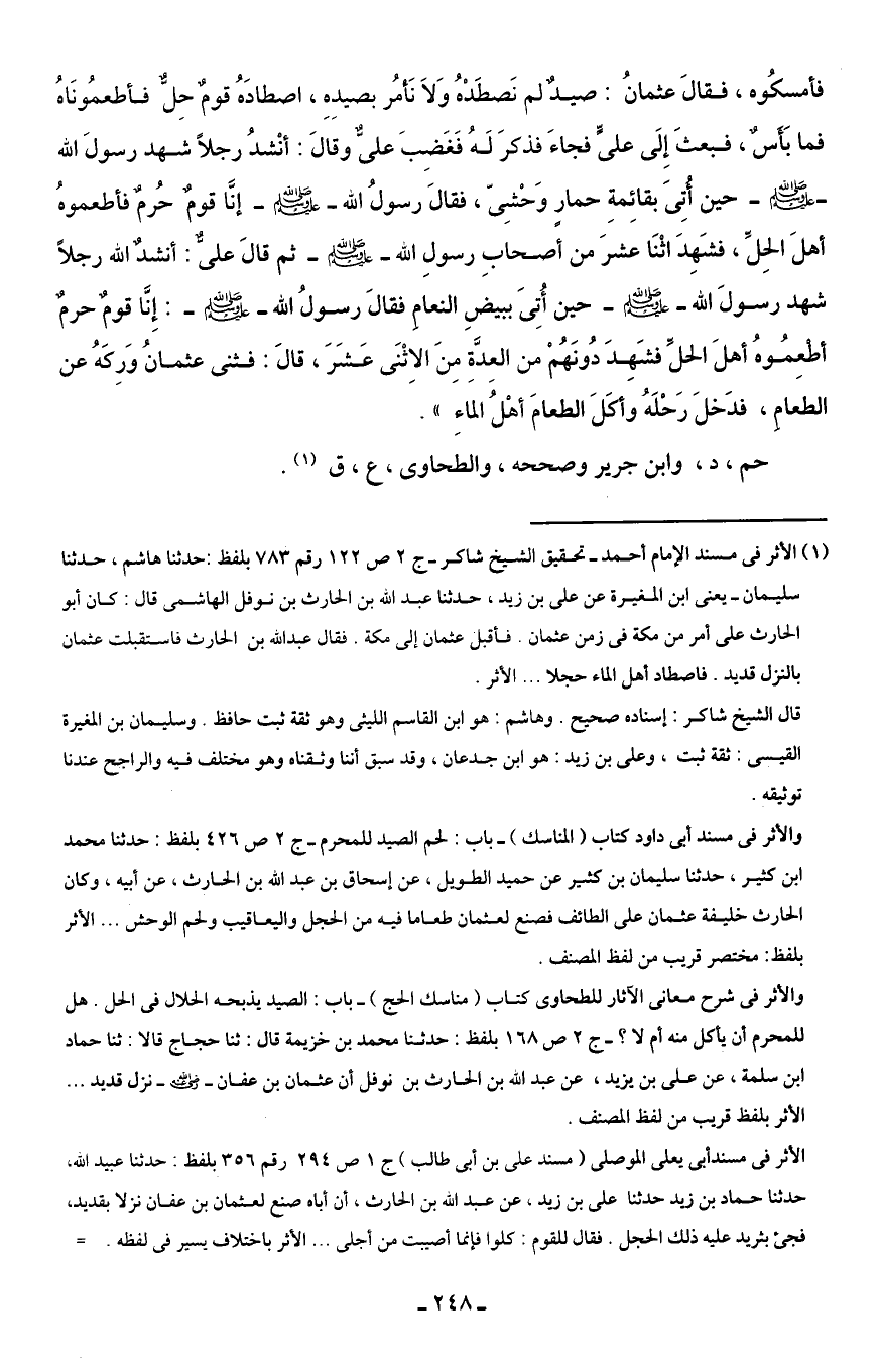 فأمسكُوه، فقالَ عثمانُ: صيدٌ لم نَصطَدْهُ وَلاَ نَأْمُر بصيدِهِ، اصطادَهُ قومٌ حِلٌّ فأطعمُونَاهُ فما بَأَسٌ، فبعثَ إِلَى عليٍّ فجاءَ فذكرَ لَهُ فَغَضِبَ علىٌّ وقالَ: أنْشدُ رجلًا شهد رسولَ الله - صلى الله عليه وسلم - حين أُتِىَ بقائِمةِ حمارٍ وَحْشِىّ، فقالَ رسولُ الله - صلى الله عليه وسلم - إنَّا قومٌ حُرمٌ فأطعموهُ أهلَ الحِلِّ، فشَهِدَ اثْنَا عشرَ من أصحابِ رسولِ الله - صلى الله عليه وسلم - ثم قالَ علىٌّ: أنشدٌ الله رجلًا شهد رسولَ الله - صلى الله عليه وسلم - حين أُتِىَ ببيضِ النعامِ فقالَ رسولُ الله - صلى الله عليه وسلم -: إِنَّا قومٌ حرمٌ أطْعِمُوهُ أهلَ الحلِّ فشَهِدَ دُونَهُمْ من العِدَّةِ مِنَ الاِثْنَى عَشَرَ، قالَ: فثنى عثمانُ وَرِكَهُ عن الطعامِ، فدَخلَ رَحْلَهُ وأكَلَ الطعامَ أهْلُ الماءِ ".
