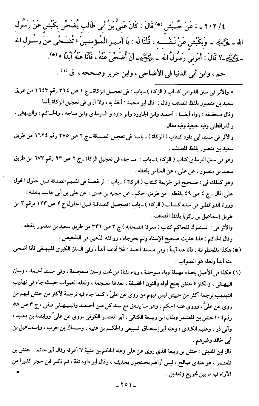 4/ 202 - " عَنْ حُبَيْشٍ (*) قَالَ: كَانَ عَلِىُّ بْنُ أَبِى طَالِبٍ يُضَحِّى بِكَبْشٍ عَنْ رَسُولِ الله - صلى الله عليه وسلم - وَبِكَبْشٍ عَنْ نَفْسِهِ، قُلنَا لَه: يَا أمِيرَ الْمُؤمِنينَ؛ تُضَحِّىَ عَنْ رَسُولِ الله - صلى الله عليه وسلم -؟ قَالَ: أَمَرنِى رَسُولُ الله - صلى الله عليه وسلم - أَنْ أُضَحِّىَ عَنْهُ، فَأَنَا عَنْهُ أَبَدًا " (*).