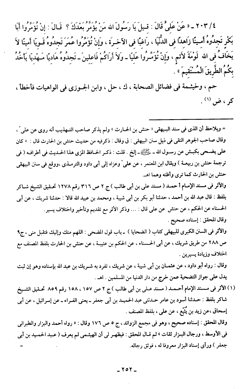 4/ 203 - " عَنْ عَلِىٍّ قَالَ: قِيلَ يَا رَسُولَ الله مَنْ يُؤَمَّرُ بَعْدَكَ؟ قَالَ: إِنْ تُؤَمِّرُوا أَبَا بَكْرٍ تَجِدُوهُ أَمِينًا زَاهِدًا فِى الدُّنْيَا، رَاغِبًا فِى الآخِرَة، وِإنْ تُؤَمِّرُوا عُمَرَ تَجِدُوهُ قَوِيّا أَمِينًا لاَ يَخَافُ فِى الله لَوْمَةَ لاَئمٍ، وِإنْ تُؤَمِّرُوا عَليّا - وَلاَ أَرَاكُمْ فَاعلينَ - تَجدُوهُ هَاديًا مَهْديّا يَأخُدُ بِكُمُ الطَّرِيقَ الْمُسْتَقِيمَ ".
