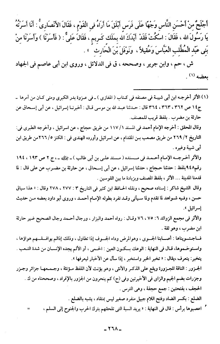 (¬1) الأثر أخرجه ابن أبى شيبة في مصنفه في كتاب (المغازى) - في عزوة بدر الكبرى ومتى كان من أمرها - ج 14 ص 362، 363، 364 قال: حدثنا عبد الله بن موسى قال: أخبرنا إسرائيل، عن أبى إسحاق عن حارثة بن مضرب. بلفظ قريب للمصنف.