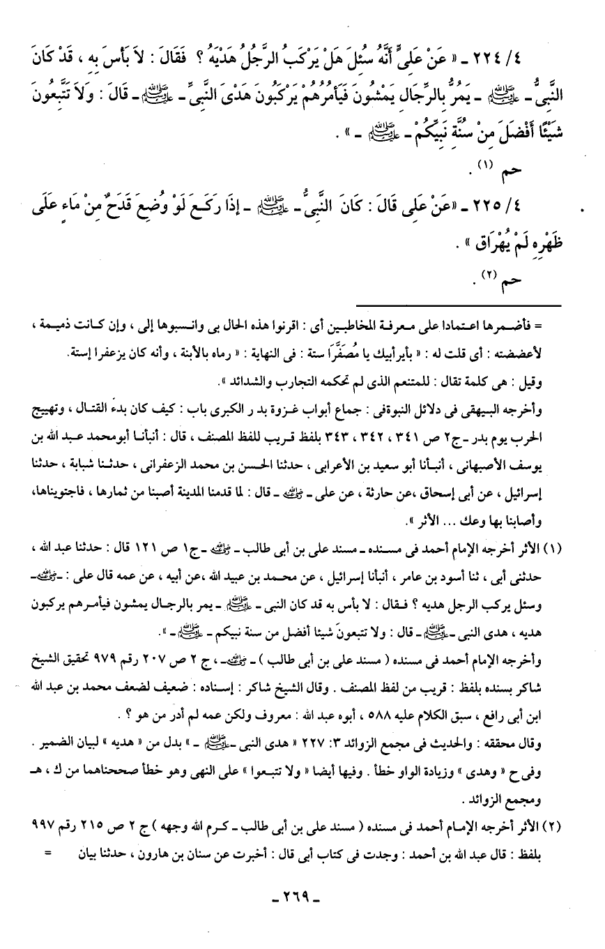 4/ 224 - " عَنْ عَلِىٍّ أَنَّهُ سُئِلَ هَلْ يَرْكَبُ الرَّجُلُ هَدْيَهُ؟ فَقَالَ: لاَ بَأسَ بِهِ، قَدْ كَانَ النَّبِى - صلى الله عليه وسلم - يَمُر بِالرِّجالِ يَمْشُونَ فَيَأمُرُهُمْ يَرْكبُونَ هَدْىَ النَّبِىَّ - صلى الله عليه وسلم - قَالَ: وَلاَ تَتَّبِعُونَ شَيْئا أفْضَلَ مِنْ سُنةِ نَبِيِّكُمْ - صلى الله عليه وسلم - ".