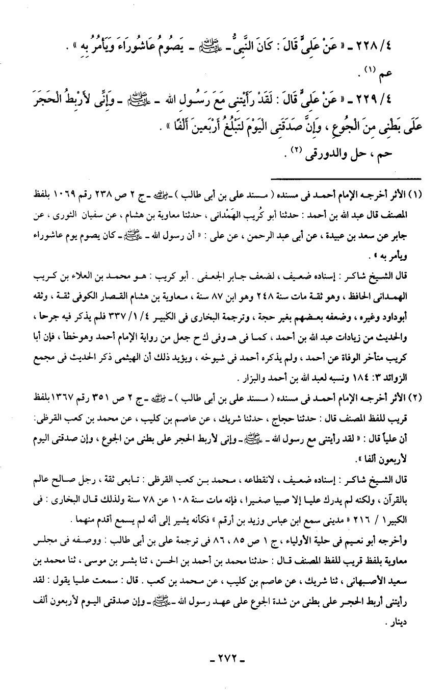 4/ 229 - " عَنْ عَلِىٍّ قَالَ: لَقَدْ رأيْتنِى مَعَ رَسُولِ الله - صلى الله عليه وسلم - وَإنِّى لأرْبِطُ الْحَجَرَ عَلَى بَطنِى مِنَ الْجُوع، وَإنَّ صَدَقَتِى اليَوْمَ لتَبْلُغُ أرْبَعينَ أَلفًا".