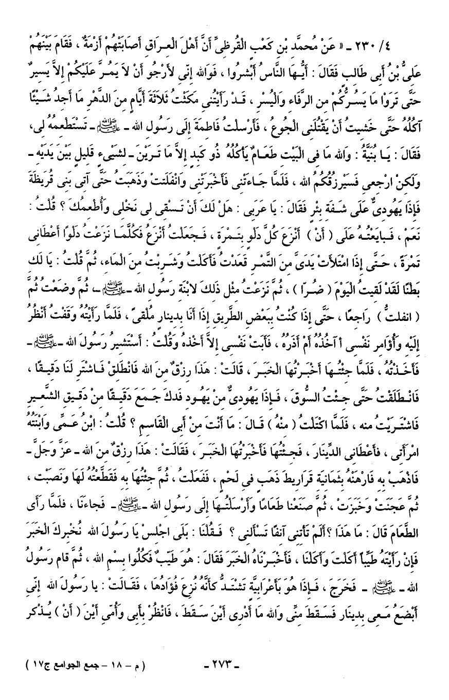 4/ 230 - "عَنْ مُحمَّدِ بْنِ كَعْب القُرظِىِّ أَنَّ أَهْلَ العرَاقِ أصَابَتْهُمْ أَزْمَةٌ، فَقَامَ بَيْنَهُمْ عَلِى بْنُ أَبِى طَالبِ فَقَالَ: أَيُّهَا النَّاسُ أبْشرُوا، فَوَالله إِني لأرْجُو أَنْ لاَ يَمُرَّ عَلَيْكُمْ إِلَّا يَسِيرٌ حَتَّى تَرَوْا مَا يَسُركُمْ مِن الرَّفاء وَاليُسْرِ، قَدْ رَأيْتُني مَكَثْتُ ثَلاَثَةَ أَيامٍ مِنَ الدَّهْرِ مَا أَجدُ شَيْئًا آكُلُهُ حَتَّى خَشِيتُ أَنْ يَقْتُلَنِى الجُوعُ، فَأرْسلتُ فَاطِمَةَ إِلَى رَسُولِ الله - صلى الله عليه وسلم - تَسْتَطعِمُهُ لِى، فَقَالَ: يَا بُنَيةُ: وَالله مَا فِى البَيْتِ طَعَامٌ يَأكلُهُ ذُو كَبِد إِلَّا مَا تَرَيْنَ - لِشَىْء قَليلٍ بَيْنَ يَدَيْهِ - وَلَكِنْ ارْجِعي فَسَيْرزُقُكُمُ الله، فَلَمَّا جَاءَتْنِى فَأخْبَرَتْنِى وَانْفَلَتتْ وَذَهَبَتُ حَتَّى آَتِى بَنِى قُرَيظَةَ فَإِذا يَهُودِىٌّ عَلَى شَفةِ بِئْرٍ فَقَالَ: يَا عَرَبِى: هَلْ لَكَ أَنْ تَسْقِى لِى نَخْلِى وَأُطْعِمُكَ؟ قُلتُ: نَعَمْ، فَبايَعْتُهُ عَلَى (أَنْ) أَنْزعَ كُلَّ دَلوٍ بِتَمْرَة، فَجَعَلتُ أَنْزعُ فَكُلَّمَا نَزَعْتُ دَلوا أَعطَانِى تَمْرَةً، حَتَّى إِذَا امْتَلأتْ يَدَىَّ مِنَ التَّمْرِ قَعَدْتُ فَأكلتُ وَشَرِبْتُ مِنَ المَاء، ثُمَّ قُلتُ: يَا لَكِ بَطنًا لَقَدْ لَقِيتُ اليَوْمَ (ضُرّا)، ثُمَّ نَزَعْتُ مِثْل ذَلِكَ لابْنَةِ رَسُولِ الله - صلى الله عليه وسلم - ثُمَّ وضَعْتُ ثُمَّ (انفلتُّ) رَاجِعًا، حَتَّى إِذَا كُنْتُ بِبَعْضِ الطَّرِيقِ إِذَا أَنَا بِدِينارٍ مُلقىً، فَلَمَّا رَأَيْتُهُ وَقَفْتُ أنْظُرُ إِلَيْهِ وَأؤَامِر نَفْسِى أآخُذُهُ أمْ أَذَرُهُ، فَأبَتْ نَفْسِى إِلاَّ أَخْذهُ وَقُلتُ: أَسْتَشِيرُ رَسُولَ الله - صلى الله عليه وسلم - فَأخَذْتُهُ، فَلَمَّا جِئْتُهَا أَخْبَرْتُهَا الخَبَرَ، قَالَتْ: هَذَا رِزْقٌ مِنَ الله فَانْطَلِقْ فَاشْتَرِ لَنَا دَقِيقًا، فَانْطَلَقْتُ حَتَّى جِئْتُ السُّوقَ، فَإِذَا يَهُودِىّ مِنْ يَهُودِ فَدكَ جَمَعَ دَقَيقًا مِنْ دَقِيقِ الشَّعِيرِ فَاشْتَرَيْتُ منه، فَلَمَّا اكتَلتُ (مِنْهُ) قَالَ: مَا أنْتَ مِنْ أبِى القَاسِم؟ قُلتُ: ابْنُ عَمِّى وَابْنَتُهُ امْرَأَتِى، فأعطَانِى الدِّينَارَ، فَجِئْتُهَا فَأَخْبَرْتُهَا الخَبَرَ، فَقَالَتْ: هَذَا رِزْقٌ مِنَ الله - عَزَ وَجَل - فَاذهَب بِهِ فَارْهَنْهُ بِثَمَانِيَة قَرَارِيطَ ذَهَبٍ في لَحْمٍ، فَفَعَلتُ، ثُمَّ جئْتُهَا به فَقَطَّعْتُهُ لَهَا وَنَصَبْت، ثُمَّ عَجَنَتْ وَخَبَزَتْ، ثُمَّ صَنَعْنا طَعَامًا وَأَرْسَلتُهَا إِلَى رَسُولِ اللهِ - صلى الله عليه وسلم - فَجاءَنَا، فلَمَّا رَأَى الطَّعَامَ قَالَ: مَا هَذَا؟ ألَمْ تَأتِنِى آنِفًا تَسْأَلنِى؟ فَقُلنَا: بَلَى اجْلسْ يَا رَسُولَ الله نُخْبِركَ الخَبَرَ فَإِنْ رَأيْتَهُ طَيِّبًا أكَلتَ وَأكَلنَا، فَأخْبَرْنَاهُ الخَبَرَ فَقَالَ: هُوَ طَيّب فَكُلُوا بِسْم الله، ثُمَّ قام رَسُولُ الله - صلى الله عليه وسلم - فَخَرَجَ، فَإذا هُوَ بَأعرَابِية تَشْتَدُّ كأَنَّهُ نُزِعَ فُؤَادُهَا، فَقَالَتْ: يا رَسُولَ الله إِنّى أبْضَعُ مَعِى بِدِينَار فَسَقَطَ مِنِّى وَالله مَا أدْرِى أيْنَ سَقَطَ، فَانْظُرْ بِأبِى وَأمِّي أيْنَ (أَنْ) يُذْكر