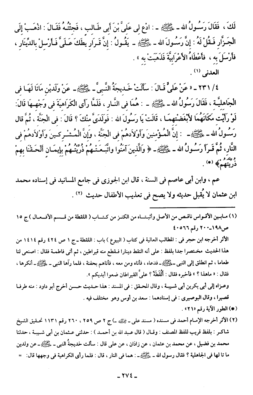 4/ 231 - "عَنْ عَلىٍّ قَالَ: سَألَتْ خَدِيجَةُ النَّبِىَّ - صلى الله عليه وسلم - عَنْ وَلَديْنِ مَاتَا لَهَا فِى الجَاهلِيةِ، فَقَالَ رَسُولُ الله - صلى الله عليه وسلم -: هُمَا فِى النَّارِ، فَلَمَّا رَأى الكَرَاهِيَةَ فِى وَجْهِهَا قَالَ: لَوْ رَأيتِ مَكَانَهُمَا لأبْغَضْتِهِمَا، قَالَتْ يَا رَسُولَ الله: فَوَلَدَىَّ مِنْكَ؟ قَالَ: فِى الجَنَّةِ، ثُمَّ قال رَسُولُ الله - صلى الله عليه وسلم -: إِنَّ الْمُؤْمِنينَ وَأَوْلاَدهُمْ فِى الجَنَّةِ، وَإنَّ الْمُشْرِكينَ وأَولاَدهُمْ فِى النارِ، ثُمَّ قَرَأ رَسُولُ الله - صلى الله عليه وسلم - {وَالَّذِينَ آمَنُوا وَاتَّبَعَتْهُمْ ذُرِّيَّتُهُمْ بِإِيمَانٍ أَلْحَقْنَا بِهِمْ ذُرِّيَّتَهُمْ} (*).