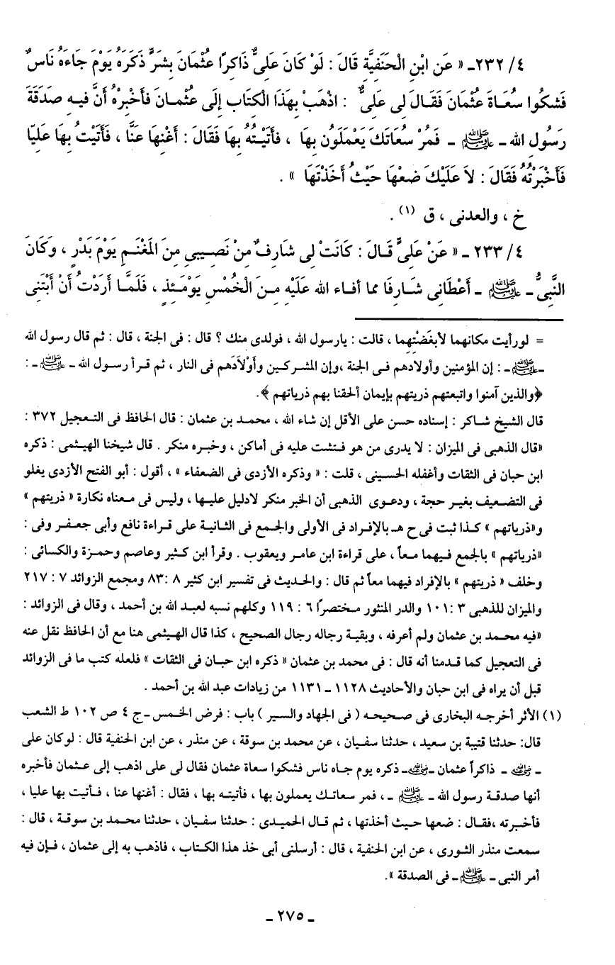 4/ 232 - "عَن ابْنِ الحَنَفِيَّة قَالَ: لَوْ كَانَ عَلِىٌّ ذَاكِرًا عثمَانَ بِشر ذَكَرَهُ يَوْمَ جَاءَهُ نَاسٌ فَشكُوا سُعَاةَ عثمَانَ فَقَالَ لِى عَلِىٌّ: اذهَبْ بِهَذَا الكِتَاب إِلَى عثمانَ فأخْبِرْهُ أنَّ فيهِ صَدَقَةَ رَسُولِ الله - صلى الله عليه وسلم - فَمُرْ سُعَاتَكَ يَعْمَلَوُن بِهَا، فأتَيْتُهُ بِهَا فَقَالَ: أَغْنِهَا عَنَّا، فَأتَيْتُ بِهَا عَلِيا فَأخْبَرْتُهُ فَقَالَ: لاَ عَلَيْكَ ضعْهَا حَيْثُ أَخَذْتَهَا".