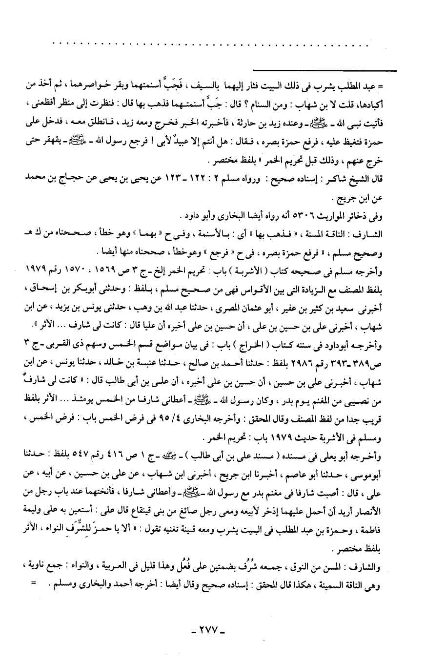 وأخرجه أبو يعلى في مسنده (مسند على بن أبى طالب) - رضي الله عنه - ج 1 ص 416 رقم 547 بلفظ: حدثنا أبو موسى، حدثنا أبو عاصم، أخبرنا ابن جريح، أخبرنى ابن شهاب، عن على بن حسين، عن أبيه، عن على، قال: أصبت شارفا في مغنم بدر مع رسول الله - صلى الله عليه وسلم - وأعطانى شارفا، فأنختهما عند باب رجل من الأنصار أريد أن أحمل عليهما إذخر لأبيعه ومعى رجل صائغ من بنى قينقاع قال على: أستعين به على وليمة فاطمة، وحمزة بن عبد المطلب في البيت يشرب ومعه قينة تغنيه تقول: " ألا يا حمزَ للِشُّرَفِ النواء، الأثر بلفظ مختصر.