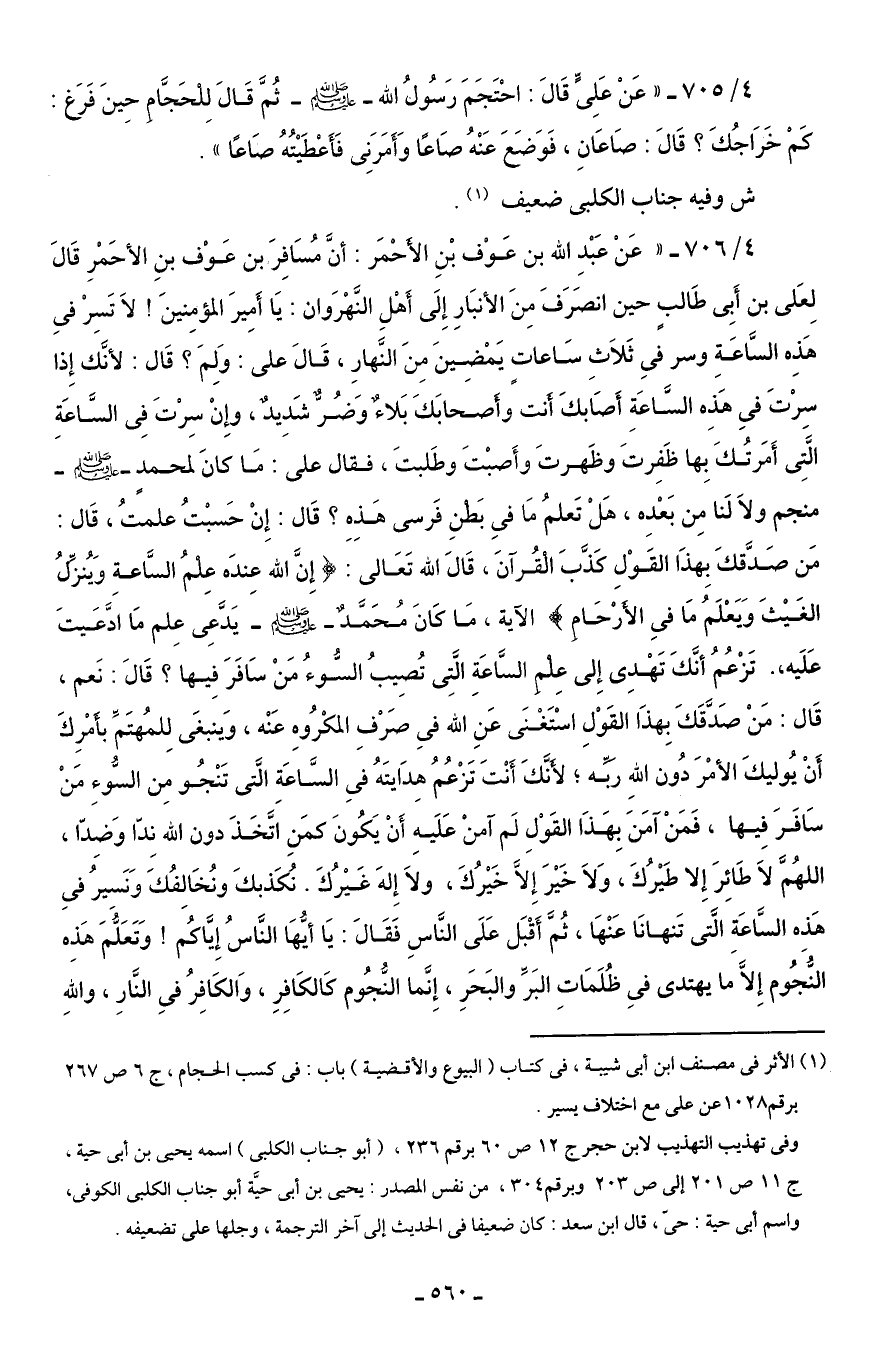 4/ 706 - "عَنْ عَبْدِ الله بن عَوْف بْنِ الأحْمَر: أنَّ مُسَافِرَ بن عَوْف بنِ الأحَمْرِ قَالَ لِعَلى بن أَبِى طَالبٍ حين انصَرَفَ مِنَ الأنبَارِ إِلَى أهْلِ النَّهْرَوان: يَا أَمِيرَ المؤمِنينَ! لاَ تَسِرْ في هَذِه السَّاعَةِ وسر في ثَلاَثِ سَاعات يَمْضِينَ مِنَ النّهارِ، قَالَ على: وَلِمَ؟ قَال: لأنَّك إِذا سِرْتَ في هَذِه السَّاعَةِ أَصَابكَ أنت وأصحابَكَ بَلاءٌ ووَضُرٌّ شَدِيدٌ، وإِنْ سِرْتَ فِى السَّاعَةِ الَّتِى أَمَرتُكَ بِها ظَفِرتَ وظَهرتَ وأَصبْتَ وطَلبتَ، فقال على: مَا كانَ لمحمد - صلى الله عليه وسلم - منجم ولاَ لَنا مِن بَعْدِه، هَلْ تَعلمُ مَا في بَطنِ فَرسى هَذِه؟ قَال: إِنْ حَسبْتُ علمتُ، قَال: مَن صَدَّقكَ بِهذَا القَوْلِ كَذَّبَ القُرآنَ، قَالَ الله تَعَالى، {إِنَّ اللَّهَ عِنْدَهُ عِلْمُ السَّاعَةِ وَيُنَزِّلُ الْغَيْثَ وَيَعْلَمُ مَا فِي الْأَرْحَامِ} الآية، مَا كَانَ مُحَمَّدٌ - صَلَّى الله عليه وسلم - يَدَّعِى عِلم مَا ادَّعَيتَ عَلَيه". تَزْعُمُ أنَّكَ تَهْدِى إِلى عِلم السَّاعَةِ الَّتِى تُصِيبُ السُّوءُ مَنْ سافَرَ فِيها؟ قَالَ. نَعم، قَال: مَنْ صَدَّقَكَ بِهذَا القَوْلِ اسْتَغْنَى عَنِ الله في صَرْفِ المكْرُوهِ عَنْه، وَينبغَى لِلمُهتَمِّ بأمرِكَ أَنْ يُوليكَ الأمْرَ دُون اللهِ ربِّه، لأنَّكَ أَنْتَ تَزْعُمُ هِدَايتَهُ في السَّاعَةِ الَّتى تَنْجُو مِن السُّوءِ مَنْ سَافَرَ فِيها، فَمَنْ آمَنَ بِهَذَا القَوْلِ لَم آمنْ عَلَيهِ أَنْ يَكُونَ كمَنِ اتَّخَذَ دون الله نِدّا وَضِدّا، اللهُمَّ لاَ طَائرَ إِلا طَيْرُكَ، وَلاَ خَيْرَ إِلَّا خَيْرُكَ، ولاَ إِلهَ غَيْرُكَ. نُكَذبكَ ونُخَالِفُكَ وَنَسيرُ في هَذِه السَّاعَةِ الَّتى تَنهانَا عَنْهَا، ثُمَّ أَقْبَل عَلَى النَّاسِ فَقَالَ: يَا أيُّهَا النَّاسُ إِيَّاكُم! وَتَعَلُّمَ هَذِه النُّجُوم إِلَّا ما يهتدى في ظُلَمَاتِ البَرِّ والبَحَرِ، إِنَّما النُّجُوم كَالكَافِرِ، وَالكَافِرُ في النَّارِ، واللهِ