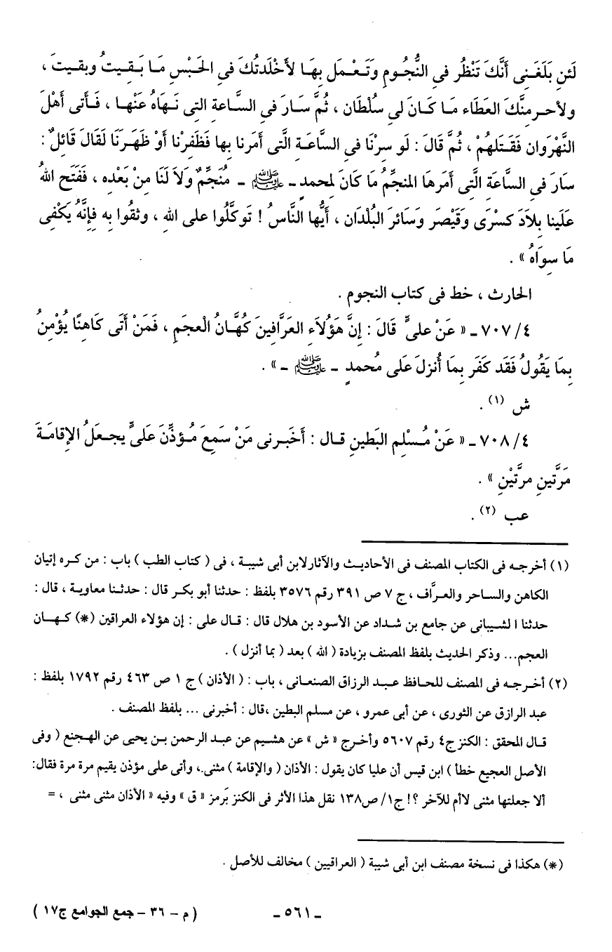 4/ 707 - "عَنْ عليٍّ قَالَ: إِنَّ هَؤُلاَء العَرَّافِينَ كُهَّانُ العجَم، فَمَنْ أَتَى كَاهِنًا يُؤْمِنُ بِمَا يَقُولُ فَقَد كفَر بِمَا أُنزلَ عَلى محمَّد - صلى الله عليه وسلم - ".