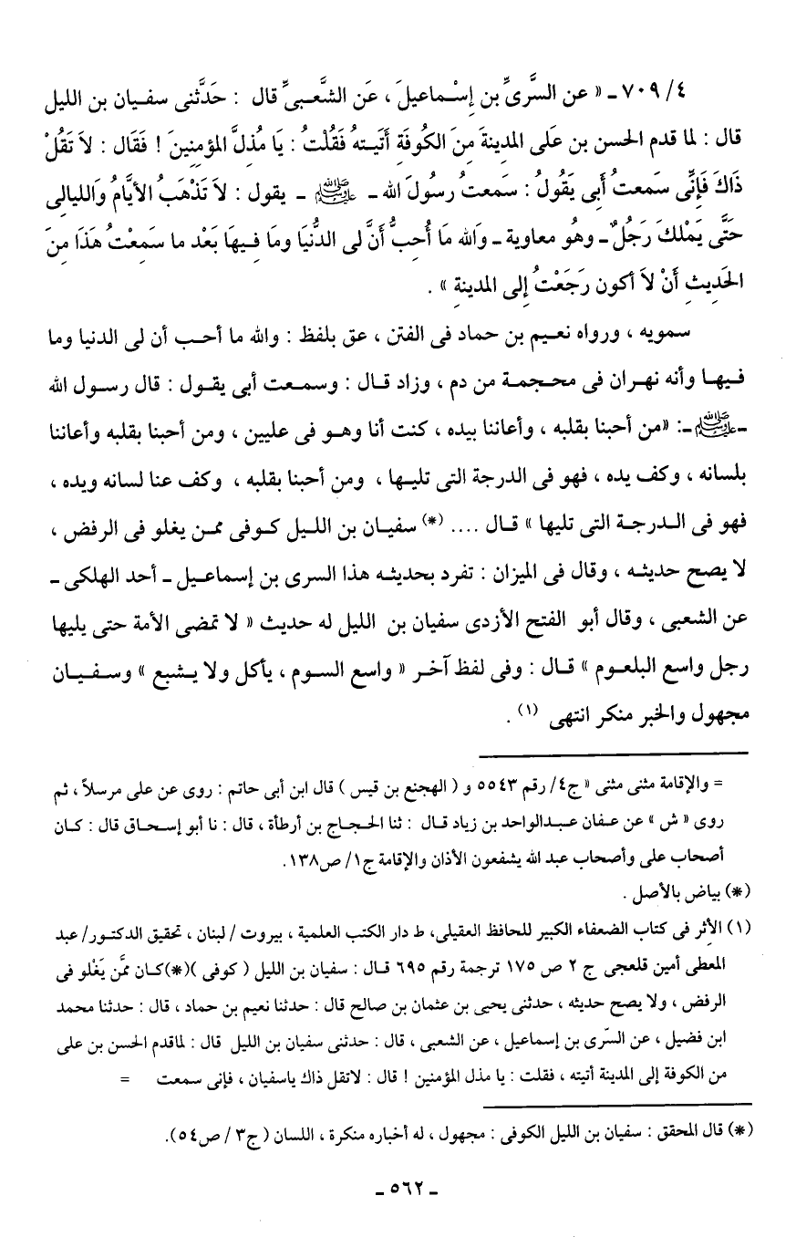 (¬1) الأِثر في كتاب الضعفاء الكبير للحافظ العقيلى، ط دار الكتب العلمبة، بيروت/ لبنان، تحقيق الدكتور/ عبد المعطى أمين قلعجى ج 2 ص 175 ترجمة رقم 695 قال: سفيان بن الليل (كوفيّ) (*) كان ممَّن يَغْلو في الرفض، ولا يصح حديثه، حدثني يَحْيَى بن عثمان بن صالح قال: حدّثنا نعيم بن حماد، قال: حدّثنا محمَّد ابن فضيل، عن السّرى بن إسماعيل، عن الشعبيّ، قال: حدثنى سفيان بن الليل قال: لما قدم الحسن بن علي من الكوفة إلى المدينة آتيته، فقلت: يا مذل المؤمنين! قال: لا تقل ذاك يا سفيان، فإنى سمعت =