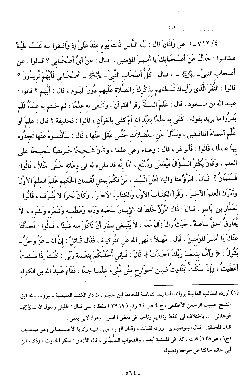 4/ 712 - "عن زَاذَانَ قال: بَيْنا النَّاس ذَاتَ يَوْمٍ عِنْدَ عَلِىٍّ إذْ وَافقوا منه نَفْسًا طيِّبةً فقالوا: حَدِّثْنَا عَنْ أَصْحَابِكَ يا أَمِيرَ المؤمنين، قال: عنْ أىِّ أَصْحَابِى؟ قالوا: عن أَصحاب النبىِّ - صلى الله عليه وسلم -، قال: كلُّ أَصْحَاب النبىِّ - صَلَّى الله عليه وسلم - أَصْحَابِى فَأيَّهُمْ تُرِيدُونَ؟ قالوا: النَّفَرَ الَّذى رَأَيناكَ تُلطفهم بِذِكرِكَ والصَّلاةِ عَلَيهم دُونَ اليَوم، قال: أَيُّهم؟ قالوا: عبد الله بن مسعود، قال: عَلِمَ السنَّةَ وقرأ القرآنَ، وَكَفى بهِ عِلمًا، ثم ختم به عِنْدَهُ فَلم يَدرُوا ما يريد بقوله: كفَى بِه عِلمًا بِعَبْدِ اللهِ أَمْ كفى بالقرآنِ، قالوا: فحذيفة؟ قال: عَلِمَ أو عُلِّم أسماءَ المنافقين، وَسَألَ عَنِ المعْضِلاَتِ حتَّى عَقَل عَنْها، قَال: سَألتُموهُ عَنْها تَجِدُوه بِهَا عالمًا، قَالُوا: فَأبو ذر، قال: وعاء وعى علمًا، وكَانَ شَحِيحًا حَريصًا شَحِيحًا على العلم، وَكَانَ يُكْثِرُ السُّؤَالَ فَيُعْطَى ويُمْنَع، أمَا إِنَّه قد ملئ له في وِعَائهِ حَتَّى امْتَلأَ، قَالُوا: فَسَلمَانُ؟ قَالَ: امْرُؤٌ منا وإلينا أَهْلَ الَبيْتِ، مَنْ لكُمْ بِمثلِ لُقْمان الحَكِيم عَلمَ العِلمَ الأوَّلَ وَأَدْرَك العِلمَ الآخِرَ، وَقَرأَ الكِتَابَ الأوَلَ وَالكِتَابَ الآخَرَ، وَكَانَ بَحرًا لا ينَزَف، قَالُوا: لِعَمَّارِ بن يَاسِر، قَالَ: ذَاك امْرُؤ خَلطَ الله الإِيمانَ بلَحْمهِ وَدَمِهِ وَعَظمِهِ وَشَعْرِهِ وَبَشَرِهِ، لاَ يُفَارِقُ الحقَّ ساعةً، حَيْثُ زَالَ زَالَ مَعَه، لاَ يَنْبِغى لِلنَّارِ أَنْ تَأكُلَ منه شَيئًا، قَالُوا: فَحدِّثْنَا عَنْكَ يَا أميرَ المؤْمِنِينَ، قَال: مَهلًا، نَهى الله عَنِ التَّزكية، فَقَال قَائِل: إِنَّ الله - عَزَ وجَل - يَقُولُ: {وَأَمَّا بِنِعْمَةِ رَبِّكَ فَحَدِّثْ} قَالَ: فَإنِّي أُحَدِّثَكُمْ بِنعْمةِ ربِّى: كنْتُ إِذَا سُئلتُ أعْطَيتُ، وَإذَا سَكَت ابْتَديتُ فبين الجوَارِح مِنِّى مُلِئَ عِلما جمّا، فَقَامَ عَبدُ الله بن الكواءِ
