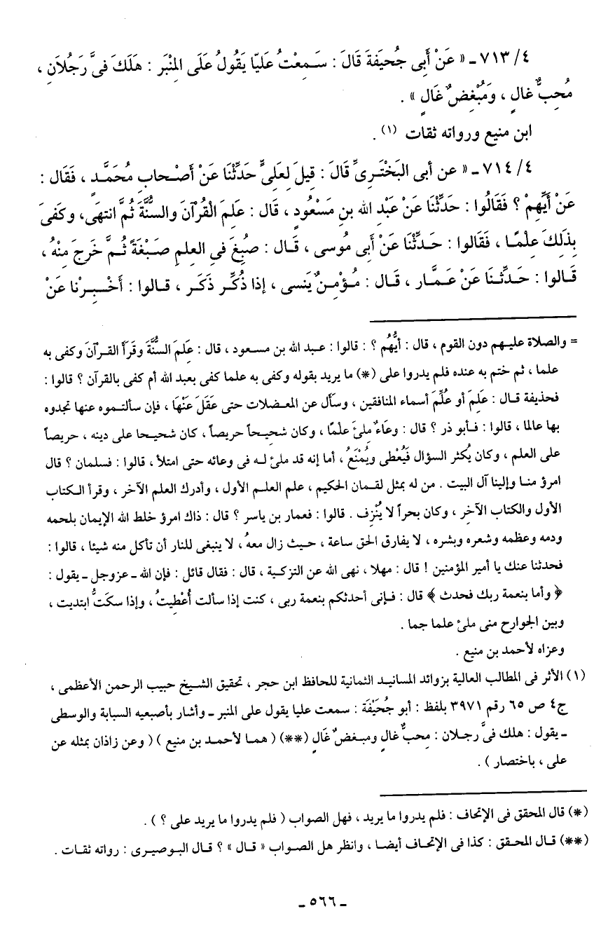 (¬1) الأثر في المطالب العالية بزوائد المسانيد الثمانية للحافظ ابن حجر، تحقيق الشَّيخ حبيب الرحمن الأعظمى، ج 4 ص 65 رقم 3971 بلفظ: أبو جُحَيْفَة. سمعت عليا يقول على المنبر - وأشار بأصبعيه السبابة والوسطى - يقول: هلك فيَّ رجلان: محبٌّ غالٍ ومبغضٌ غالٍ (* *) (هما لأحمد بن منيع) (وعن زاذان بمثله عن على، باختصار).