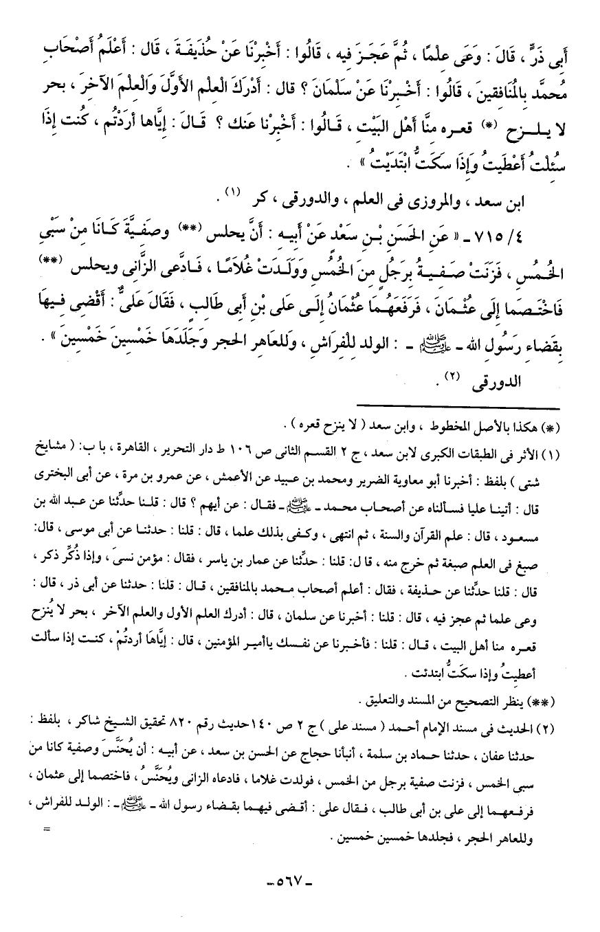 4/ 715 - "عَنِ الحَسَنِ بْنِ سَعْد عَنْ أبِيهِ: أَنَّ يحلس (* *) وصَفيَّةَ كَانَا مِنْ سَبْي الخُمُسِ، فَزَنَتْ صَفِيةُ بِرَجُلٍ مِنَ الخُمُسِ وَوَلَدَتْ غُلاَمًا، فَادَّعى الزًّانِى ويحلس (* *) فَاخْتَصما إِلَى عُثْمَانَ، فَرَفَعَهُمَا عثمَانُ إِلَى عَلى بْنِ أَبِى طَالِب، فَقَالَ عَلىٌّ: أَقْضِى فِيهَا بِقَضاءِ رَسُولِ الله - صلى الله عليه وسلم -: الولد لِلفِرَاشِ، وَللعَاهِر الحجر وَجلَدَهَا خَمْسِينَ خَمْسِينَ".