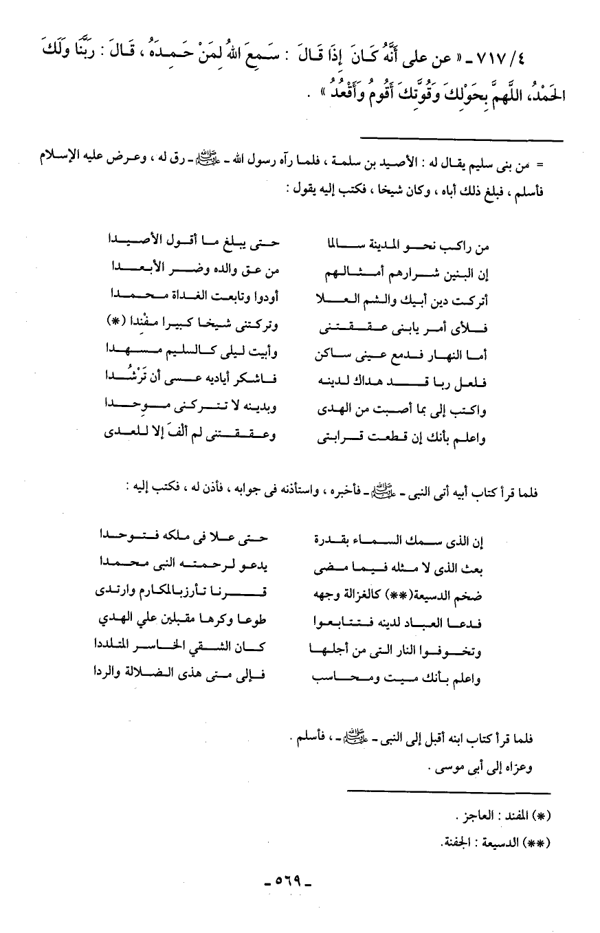 = من بنى سليم يقال له: الأصيد بن سلمة، فلما رآه رسول الله - صَلَّى الله عليه وسلم - رق له، وعرض عليه الإسلام فأسلم، فبلغ ذلك أباه، وكان شيخًا، فكتب إليه يقول:
