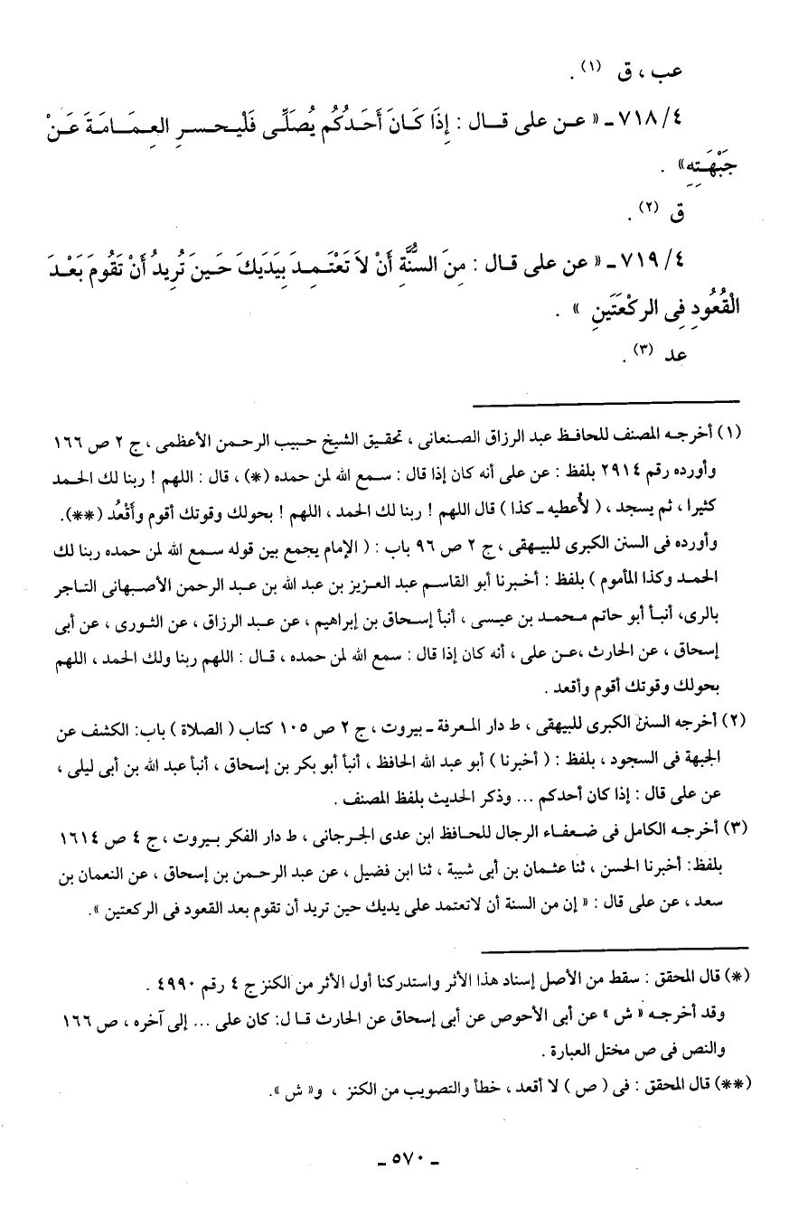 (¬3) أخرجه الكامل في ضعفاء الرجال للحافظ ابن علي الجرجانيّ، ط دار الفكر بيروت، ج 4 ص 1614 بلفظ: أخبرنا الحسن، ثنا عثمان بن أبي شيبة، ثنا ابن فضيل، عن عبد الرحمن بن إسحاق، عن النُّعمان بن سعد، عن عليٍّ قال: "إن من السنة أن لا تعتمد على يديك حين تريد أن تقوم بعد القعود في الرّكعتين".