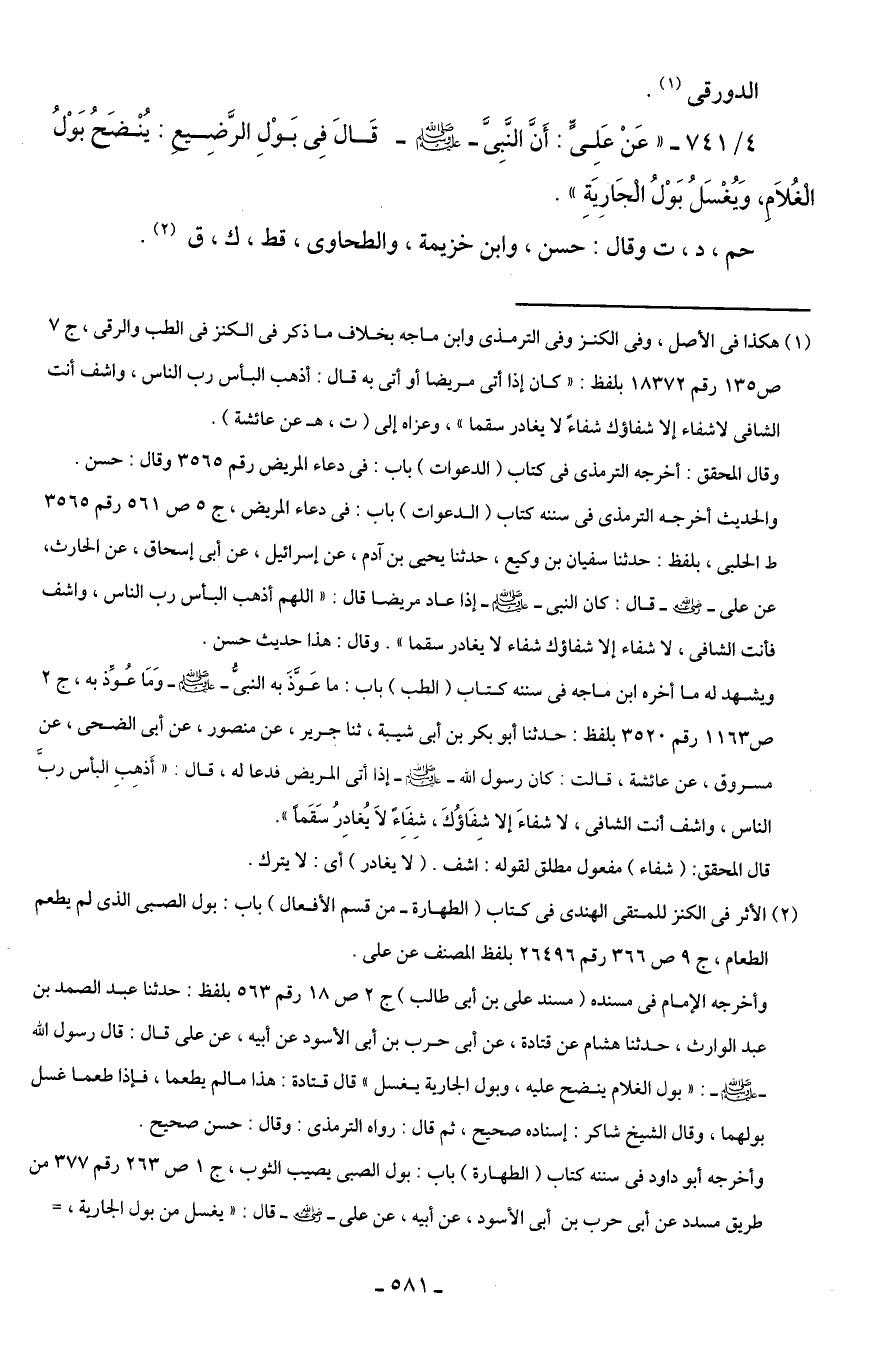 4/ 741 - "عَنْ عَلِىٍّ: أَنَّ النَّبِىَّ - صلى الله عليه وسلم - قَالَ فِى بَوْلِ الرَّضِيع: يُنْضَحُ بَوْلُ الغُلاَم، وَيُغْسَلُ بَوْلُ الجَارِيَةِ".