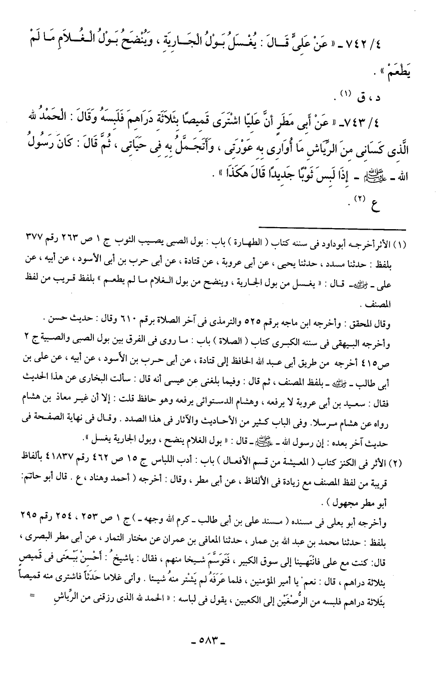 4/ 742 - "عَنْ عَلِيٍّ قَالَ: يُغْسَلُ بَوْلُ الجَارِيَةِ، وَيُنْضَحُ بَوْلُ الغُلاَم مَا لَمْ يَطعَمْ".