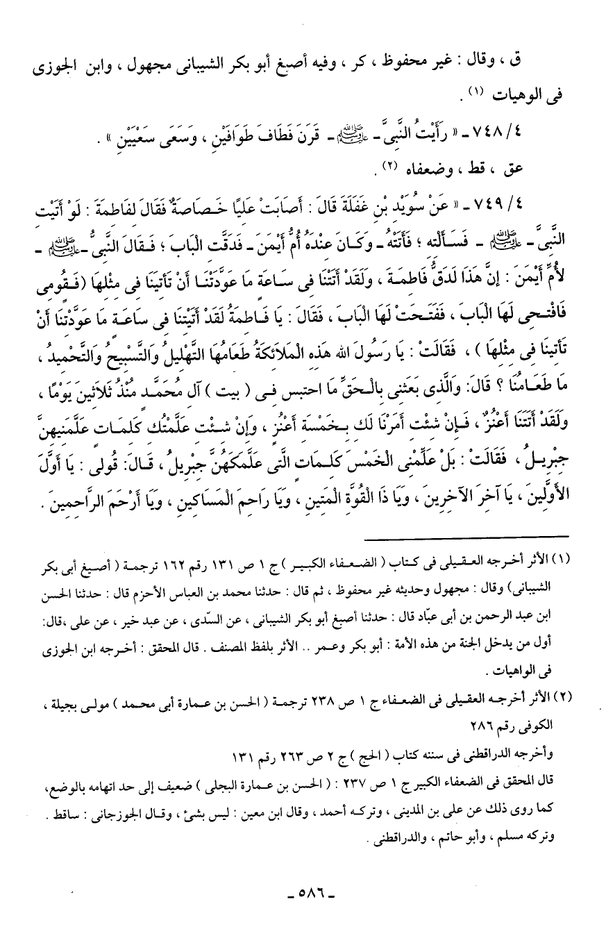 4/ 749 - "عَنْ سُوَيْدِ بْنِ غَفَلَةَ قَالَ: أَصَابَتْ عَلِيًا خَصَاصَةٌ فَقَالَ لِفَاطِمَةَ: لَوْ أَتَيْتِ النَّبِىَّ - صلى الله عليه وسلم - فَسَأَلتِه؛ فَأَتَتْهُ - وَكَانَ عِنْدَهُ أُمُّ أَيْمَنَ - فَدَقَّتِ البَابَ؛ فَقَالَ النَّبِى - صَلَّى الله عليه وسلم - لأمِّ أَيْمَنَ: إنَّ هَذَا لَدَقُّ فَاطِمَةَ، وَلَقَدْ أَتَتْنَا فِى سَاعَةٍ مَا عَوَدَتْنَا أَنْ تَأتِيَنَا فِى مِثْلِهَا (فَقُومِى فَافْتحِى لَهَا البَابَ، فَفَتَحَتْ لَهَا الْبَابَ، فَقَالَ: يَا فَاطِمَةُ لَقَدْ أَتَيْتِنَا فِى سَاعَة مَا عَوَّدْتِنَا أَنْ تَأتِينَا فِى مِثْلِهَا)، فَقَالَتْ: يَا رَسُولَ الله هَذِهِ المَلاَئِكَةُ طَعَامُهَا التَّهْلِيلُ وَالتسبيحُ وَالتَّحْمِيدُ، مَا طَعَامُنَا؟ قَالَ: وَالَّذِى بَعَثنِى بِالحَقِّ مَا احتبس فِى (بيت) آلِ مُحَمَّدِ منذ ثَلاَثِينَ يَوْمًا، وَلَقَدْ أَتَتَنَا أَعْنُزٌ، فَإِنْ شِئْتِ أَمَرْنَا لَك بخَمْسَةِ أَعْنُزٍ، وَإنْ شِئْتِ عَلمْتُكِ كلِمَات عَلَّمَنِيهِن جِبْرِيلُ، فَقَالَتْ: بَلْ عَلمْنِى الخَمْسَ كلمَات الَّتى عَلمَكَهُن جِبْرِيلُ، قَالَ: قُولى: يَا أَوَّلَ الأوَّلِينَ، يَا آخِرَ الآخِرِينَ، وَيَا ذَا القُوةِ المَتِينِ، وَيَا رَاحِمَ المَسَاكِينِ، وَيَا أَرْحَمَ الراحِمِينَ.