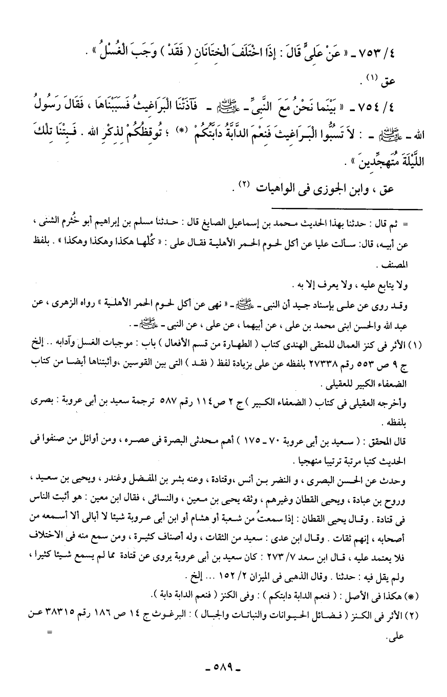 4/ 753 - "عَنْ عَلِىٍّ قَالَ: إذا اخْتَلَفَ الخِتَانَانِ (فَقَدْ) وَجَبَ الغُسْلُ".