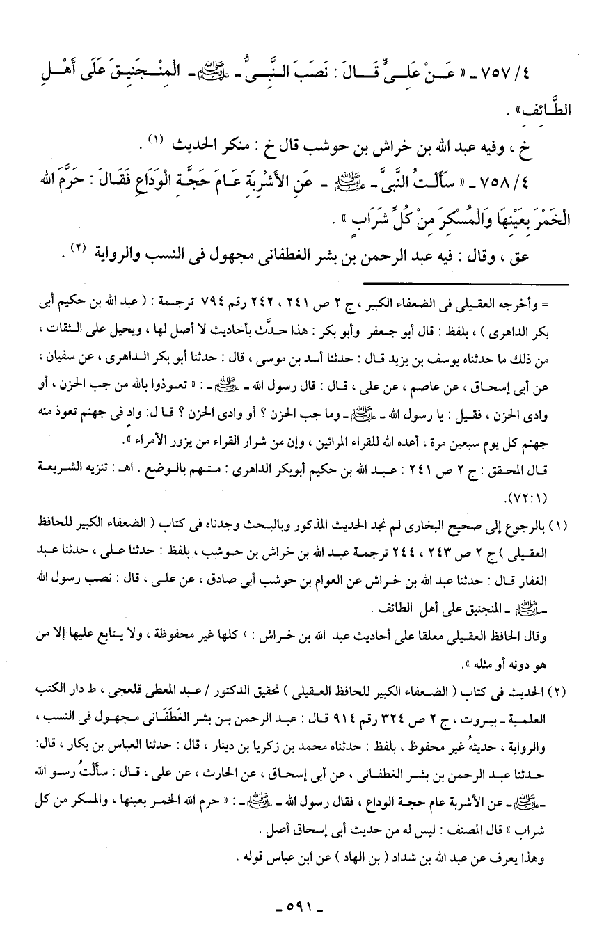(¬2) الحديث في كتاب (الضعفاء الكبير للحافظ العقيلى) تحقيق الدكتور/ عبد المعطى قلعجى، ط دار الكتب العلمية - بيروت، ج 2 ص 324 رقم 914 قال: عبد الرحمن بن بشر الغَطَفَانى مجهول في النسب، والرواية، حديثهُ غير محفوظ، بلفظ: حدثناه محمد بن زكريا بن دينار، قال: حدثنا العباس بن بكار، قال: حدثنا عبد الرحمن بن بشر الغطفانى، عن أبى إسحاق، عن الحارث، عن علي، قال: سأَلْتُ رسول الله - صلى الله عليه وسلم - عن الأشربة عام حجة الوداع، فقال رسول الله - صلى الله عليه وسلم -: "حرم الله الخمر بعينها، والمسكر من كل شراب" قال المصنف: ليس له من حديث أبى إسحاق أصل.