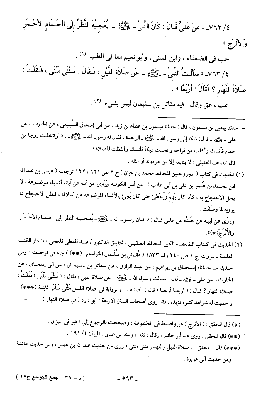 (¬2) الحديث في كتاب الضعفاء الكبير للحافظ العقيلى، تحقيق الدكتور/ عبد المعطى قلعجى، ط دار الكتب العلمية - بيروت ج 4 ص 240 رقم 1833 (مُقاتل بن سُلَيمان الخراسانى (* *)) جاء في ترجمته: ومن حديثه ما حدثناه إسحاق بن إبراهيم، عن عبد الرازق، عن مقاتل بن سليمان، عن أبى إسحاق، عن الحارث، عن علي - صلى الله عليه وسلم - قال: سألت رسول الله - صلى الله عليه وسلم - عن صلاة الليل، فقال: "مَثْنَى مَثْنَى" فَقُلْتُ: صلاة النهار؟ قال: "أربعا أربعا" قال: المصنف: والرواية في صلاة الليل مَثْنَى مَثْنَى ثابتة (* * *). والحديث له شواهد كثيرة تؤيده، فقد روى أصحاب السنن الأربعة: أبو داود (في صلاة النهار) =