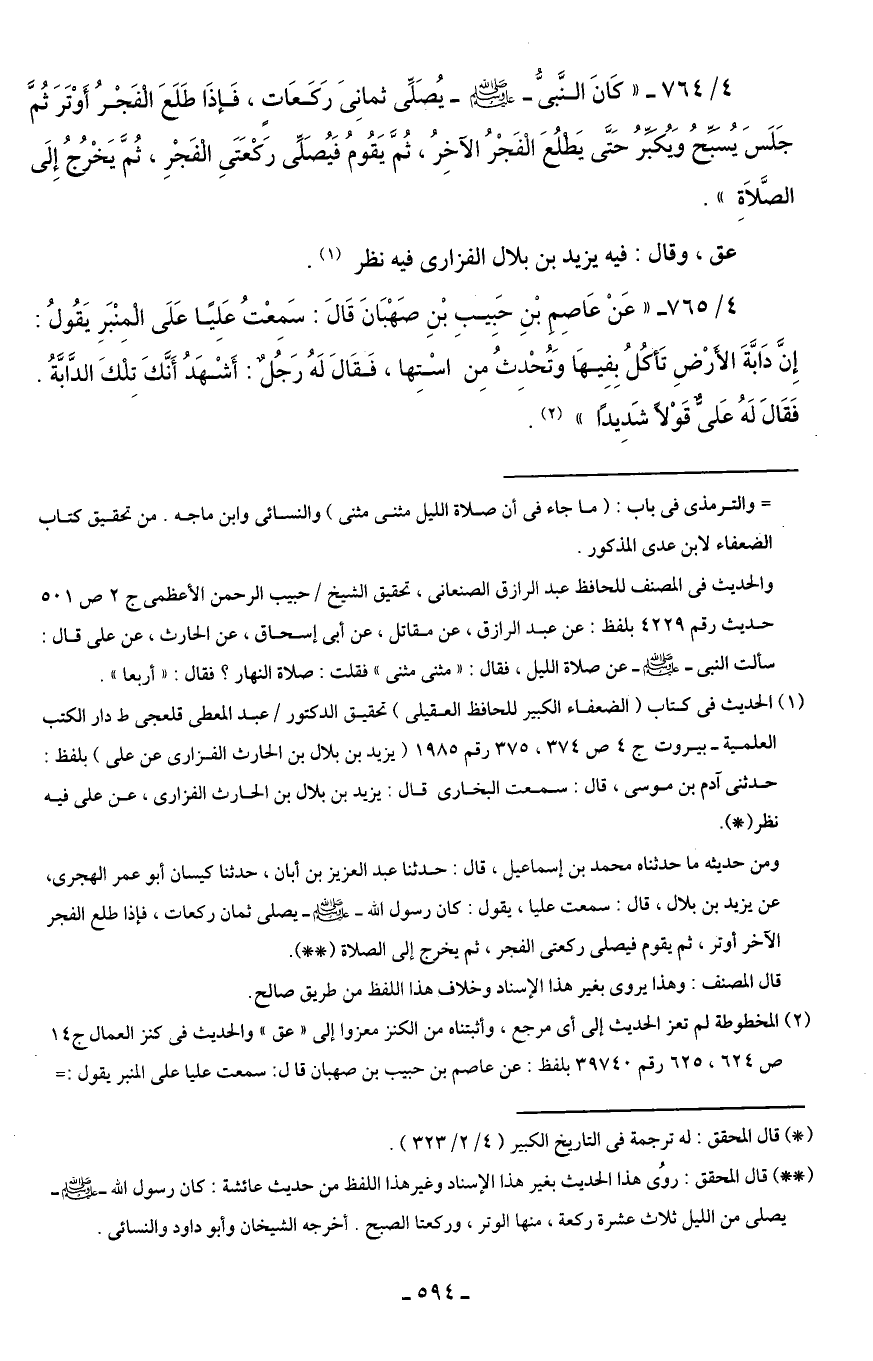 4/ 764 - "كَانَ النَّبيُّ - صلى الله عليه وسلم - يُصَلِّى ثمانِىَ رَكَعَات، فَإذَا طَلَعَ الْفَجْرُ أَوْتَرَ ثُمَّ جَلَسَ يُسَبِّحُ وَيُكَبِّرُ حَتَّى يَطلُعَ الفَجْرُ الآخِرُ، ثُمَ يَقُومُ فَيُصَلِّى رَكْعَتَىِ الْفَجْرِ، ثُمَّ يَخْرُجُ إِلَى الصَّلَاةِ".