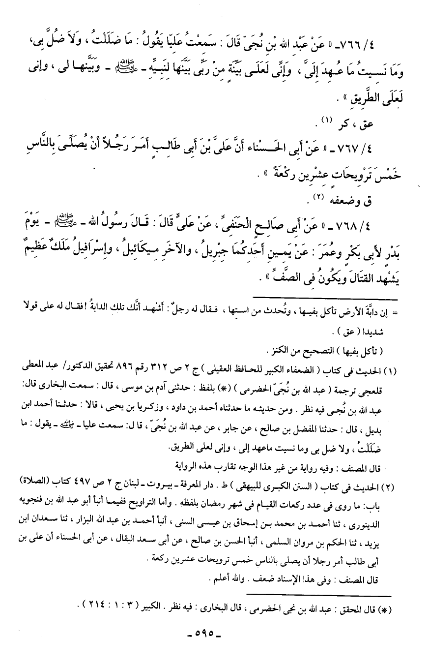 (¬1) الحديث في كتاب (الضعفاء الكبير للحافظ العقيلى) ج 2 ص 312 رقم 896 تحقيق الدكتور/ عبد المعطى قلعجى ترجمة (عبد الله بن نُجَىّ الحضرمى) (*) بلفظ: حدثنى آدم بن موسى، قال: سمعت البخارى قال: عبد الله بن نُجى فيه نظر. ومن حديثه ما حدثناه أحمد بن داود، وزكريا بن يحيى، قالا: حدثنا أحمد ابن بديل، قال: حدثنا المفضل بن صالح، عن جابر، عن عبد الله بن نُجَىّ، قال: سمعت عليا - رضي الله عنه - يقول: ما ضَلَلْتُ، ولا ضل بى وما نسيت ما عهد إلي، وإنى لعلى الطريق.