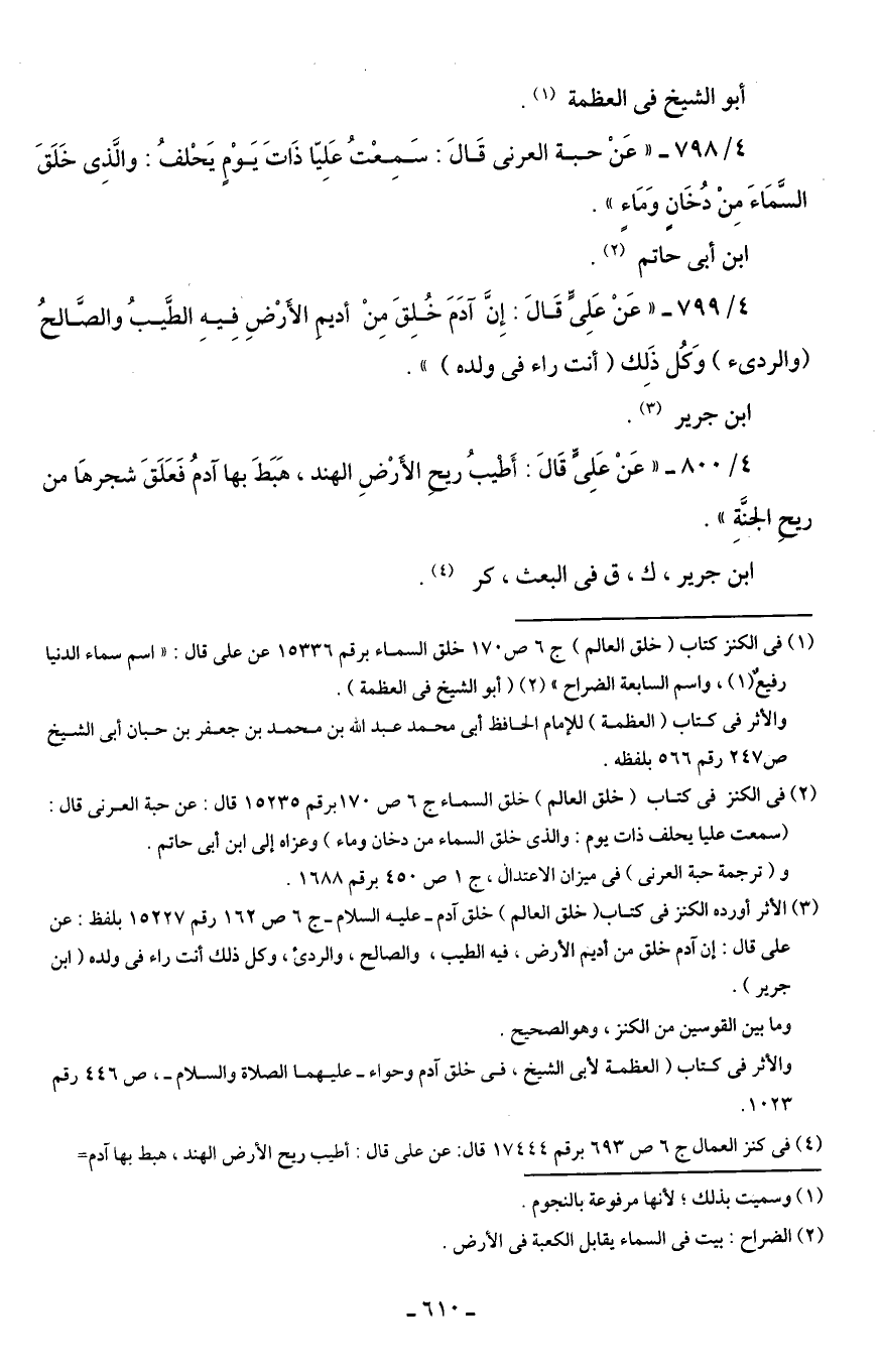 (¬2) في الكنز في كتاب (خلق العالم) خلق السماء ج 6 ص 170 برقم 15235 قال: عن حبة العرنى قال: (سمعت عليا يحلف ذات يوم: والذى خلق السماء من دخان وماء) وعزاه إلى ابن أبى حاتم.