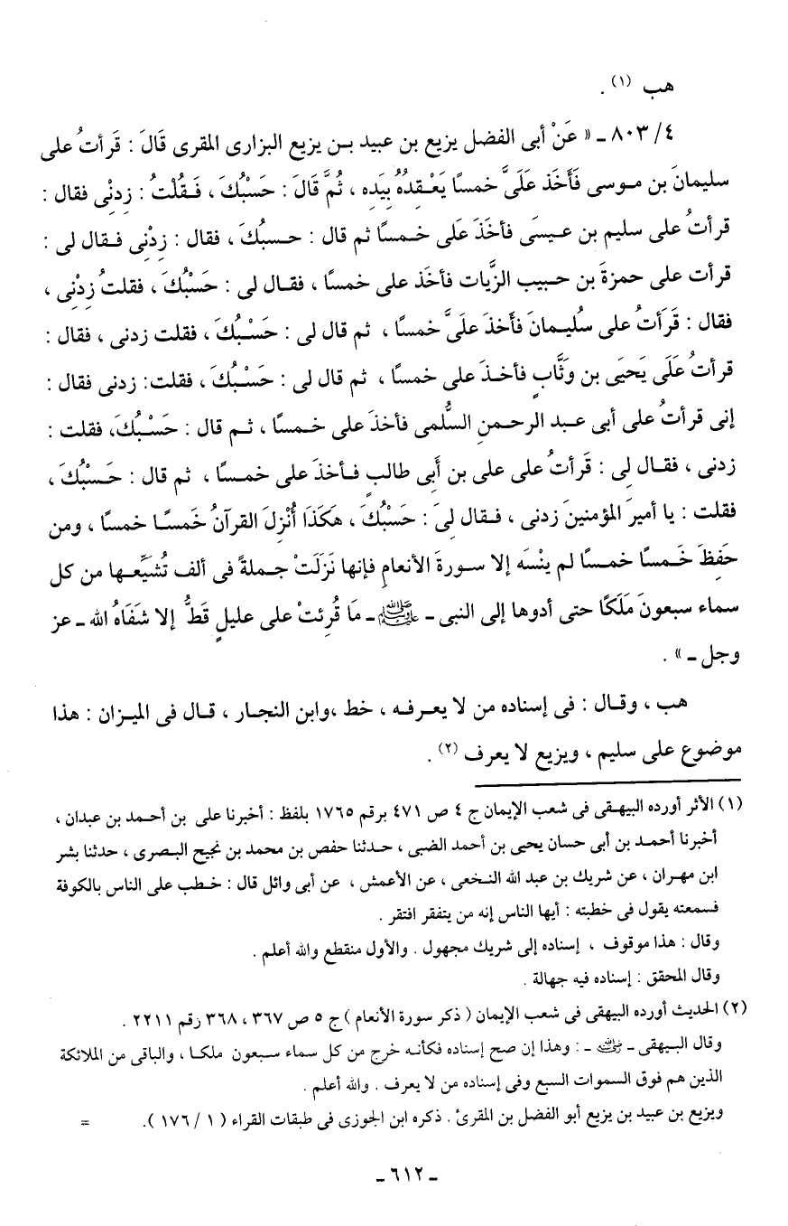 4/ 803 - "عَنْ أبى الفضل يزيع بن عبيد بن يزيع البزارى المقرى قَالَ: قَرأتُ عَلَى سليمانَ بن موسى فَأَخَذ عَلَىَّ خمسًا يَعْقِدُهُ بِيَدِه، ثُمَّ قَالَ: حَسْبُكَ، فَقُلتُ: زِدنى فَقَالَ: قرأتُ عَلَى سليم بن عيسَى فأخَذَ عَلى خمسًا ثم قال: حسبُكَ، فَقَالَ: زِدْنِى فَقَالَ لى: قرأت عَلَى حمزةَ بن حبيب الزَّيَات فأخَذ عَلَى خمسًا، فَقَالَ لى: حَسْبُكَ، فقلتُ زِدْنِى، فَقَالَ: قَرَأتُ عَلَى سُليمانَ فأخذَ علَيَّ خمسًا، ثم قال لى: حَسْبُكَ، فقلت زدنى، فَقَالَ: قرأتُ عَلَى يَحيَى بن وَثَّابٍ فأخذَ عَلَى خمسًا، تم قال لى: حَسْبُكَ، فقلت: زدنى فَقَالَ: إنى قرأتُ عَلَى أبى عبد الرحمنِ السُّلمى فأخذَ عَلَى خمسًا، ثم قال: حَسْبُكَ، فقلت: زدنى، فَقَالَ لِى: قَرأتُ عَلَى عَلَي بن أَبِى طالب فأخذَ عَلَى خمسًا، ثم قال: حَسْبُكَ، فقلت: يا أميرَ المؤمنينَ زدنى، فَقَالَ لِىَ: حَسْبُكَ، هَكَذَا أُنْزِلَ القرآنُ خَمسًا خمسًا، ومن حَفِظَ خَمسًا خمسًا لم ينْسَه إلا سورةَ الأنعامِ فإنها نَزَلَتْ جملةً في ألف تُشَيِّعها مِن كل سماء سبعونَ مَلَكًا حتى أدوها إلى النبى - صلى الله عليه وسلم - مَا قُرِئتْ عَلَى عليلٍ قَطُّ إلا شَفَاهُ الله - عز وجل - ".