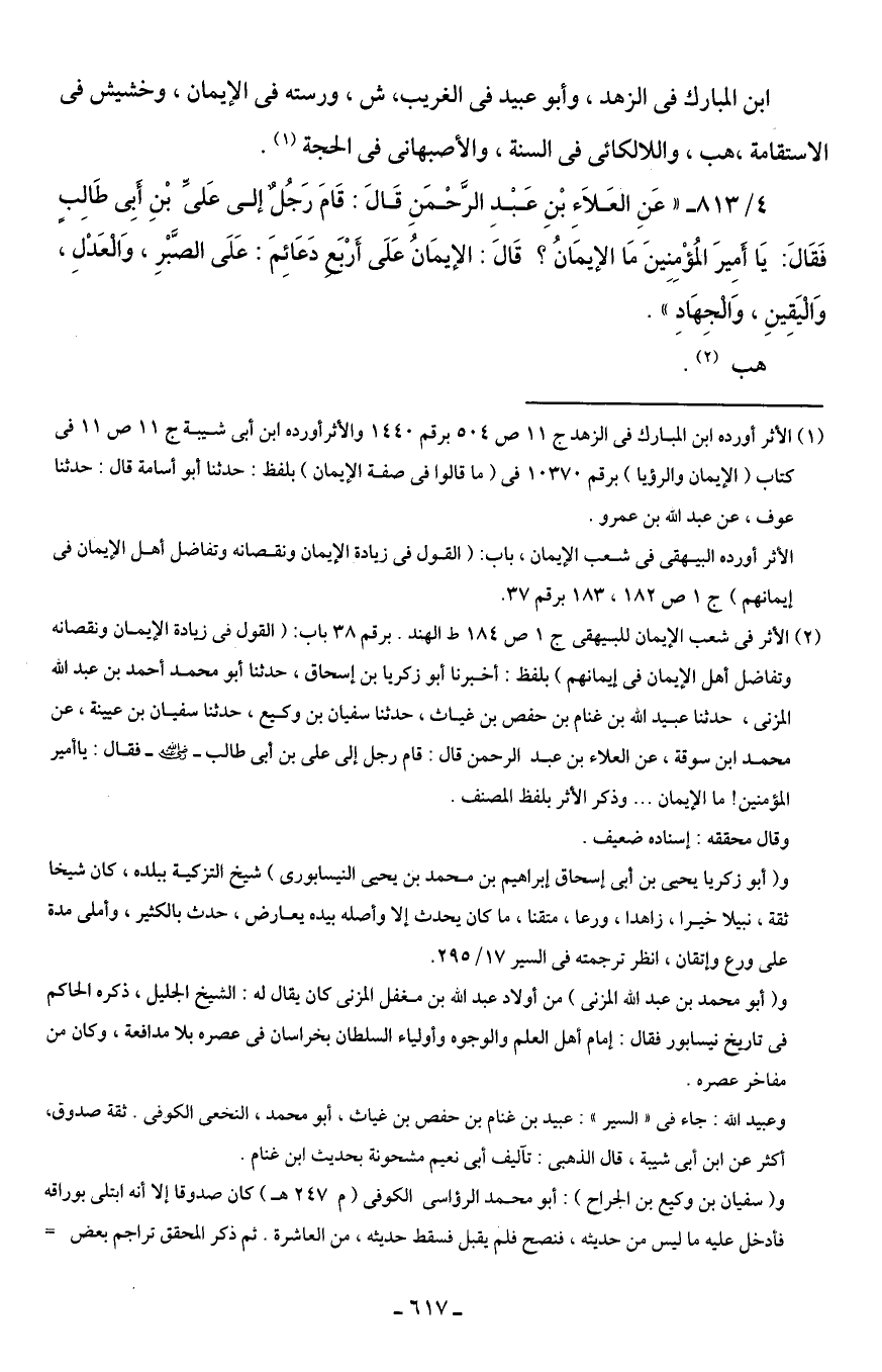 4/ 813 - "عَنِ العَلَاءِ بْنِ عَبْدِ الرَّحْمَنِ قَالَ: قَامَ رَجُلٌ إلى عَليِّ بْنِ أَبِى طَالِبٍ فَقَالَ: يَا أَمِيرَ المُؤْمِنِينَ مَا الإيمَانُ؟ قَالَ: الإيمَانُ على أَرْبَعِ دَعَائِمَ: عَلَى الصَّبْرِ، وَالْعَدْلِ، وَالْيَقِينِ، وَالْجِهَادِ".