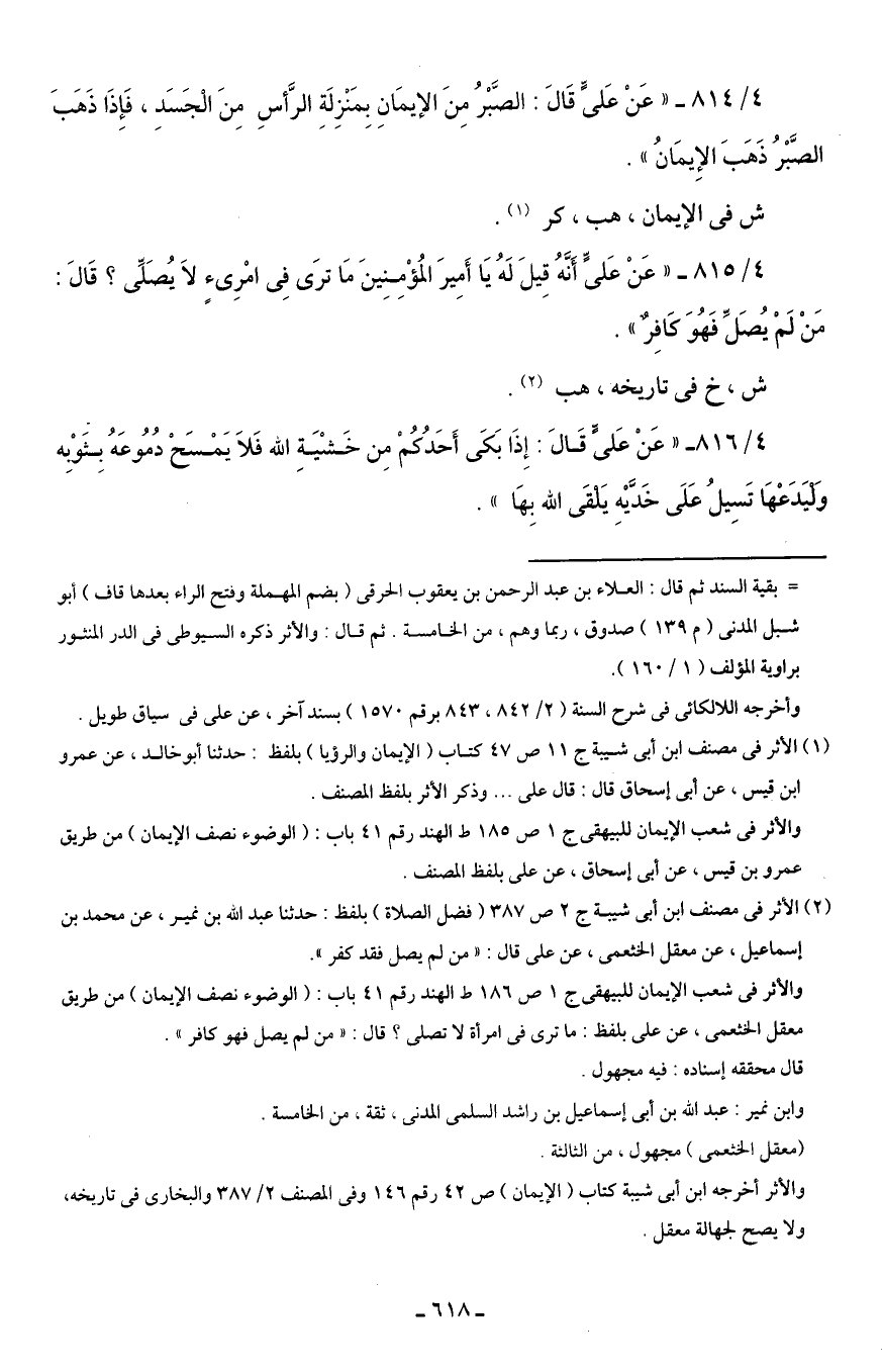 4/ 814 - "عَنْ عَلىٍّ قَالَ: الصَّبْرُ مِنَ الإيمَانِ بِمَنْزِلَةِ الرَّأسِ مِنَ الْجَسَدِ، فَإِذَا ذَهَبَ الصَّبْرُ ذَهَبَ الإِيمَانُ".