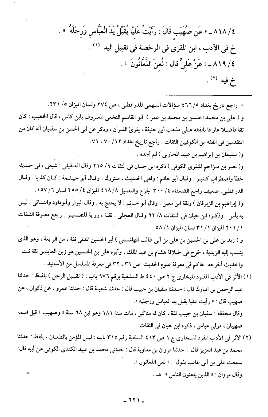 (¬1) الأثر في الأدب المفرد للبخارى ج 2 ص 440 ط السلفية برقم 976 باب: (تقبيل الرجل) بلفظ: حدثنا عبد الرحمن بن المبارك قال: حدثنا سفيان بن حبيب قال: حدثنا شعبة قال: حدثنا عمرو، عن ذكوان، عن صهيب قال: "رأيت عليا يقبل يد العباس ورجليه".